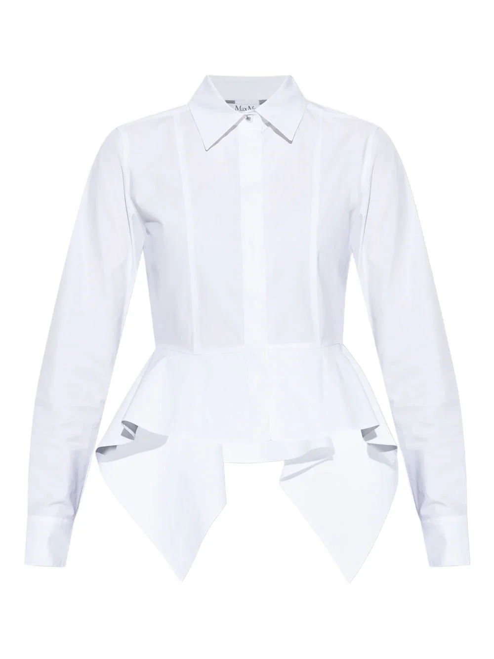 Stretch cotton poplin shirt. Peplos detail with asymmetrical ruffle. Concealed buttons on the front. Logo buttons on cuffs and collar. product code: 2521116011600001GAMMA COMPOSITION 97% cotton, 3% elastane. MADE IN ITALY