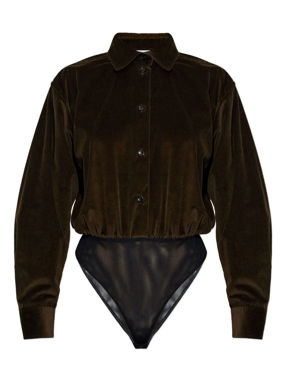 Corduroy stretch cotton bodysuit. Wide line. Shirt collar and cuffs. Front button closure on the front. Tone-on-tone tulle thong with snap buttons on the bottom. product code: 2521116033600005 FERTILE COMPOSITION 98% cotton, 2% elastane; 94% polyamide, 6% elastane. MADE IN ITALY
