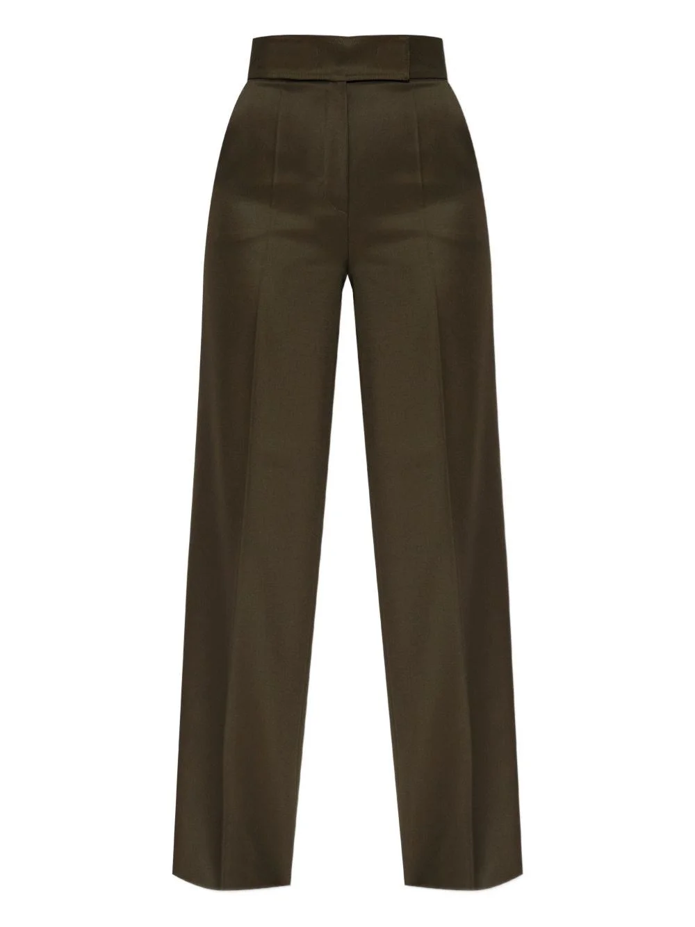 Pure green wool gabardine pants with high waist and wide leg. High waist strip closure, zip with flap and hook. Pockets on the sides. Back welt pockets. Stretched fold and pleats sewn at the waist on the back. Lined. product code: 2521136263600009 ARTURO1234 COMPOSITION 100% virgin wool. MADE IN ITALY