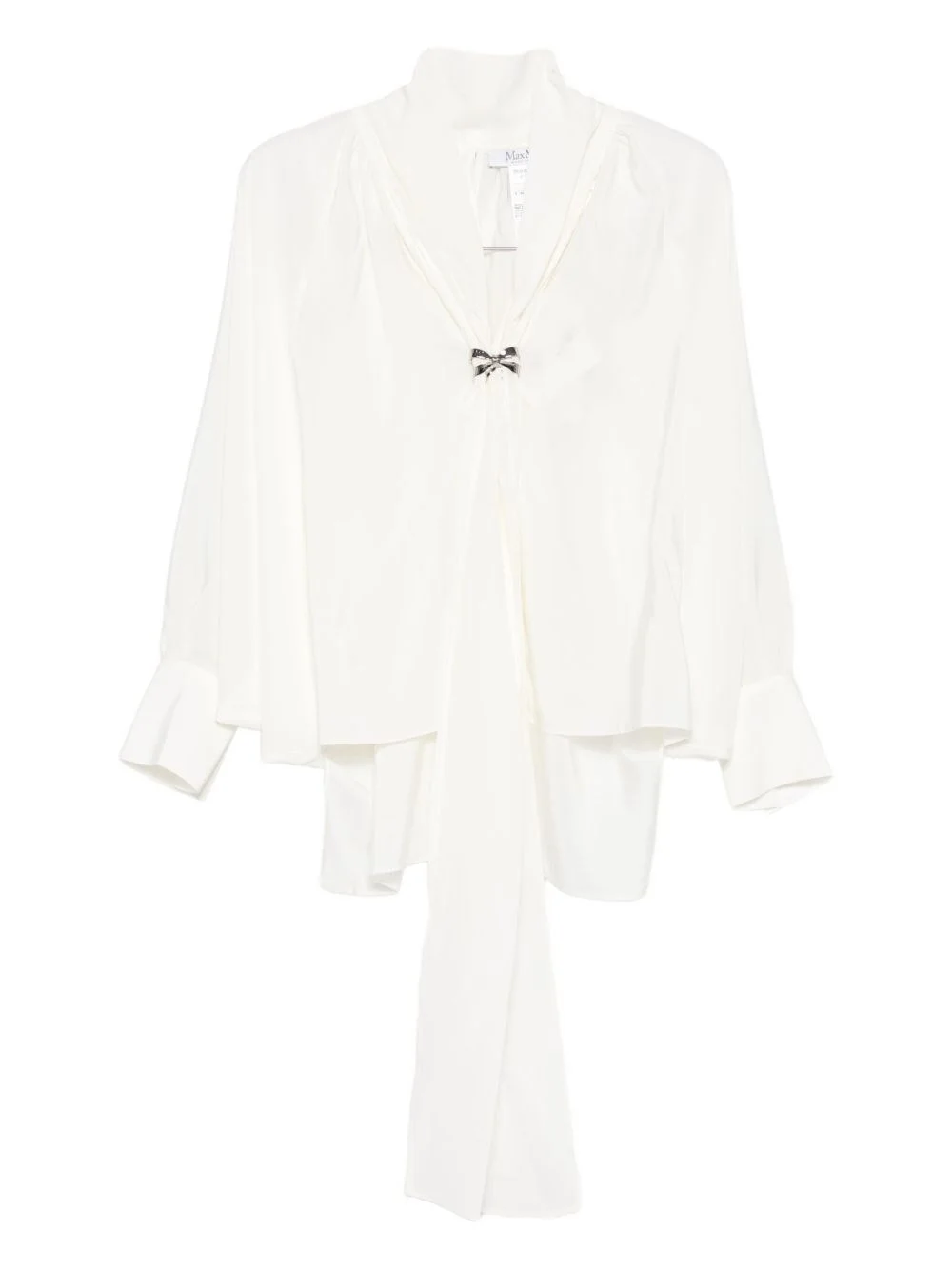 Silk crepe de chine blouse with wide sleeves and bat raglan. V-neck with scarf collar to be tied in a bow. Split in the center at the back. Removable metal jewel loop. Asymmetrical bottom longer at the back. product code: 2521116081600001LEONIDA COMPOSITION 100% silk. MADE IN ITALY