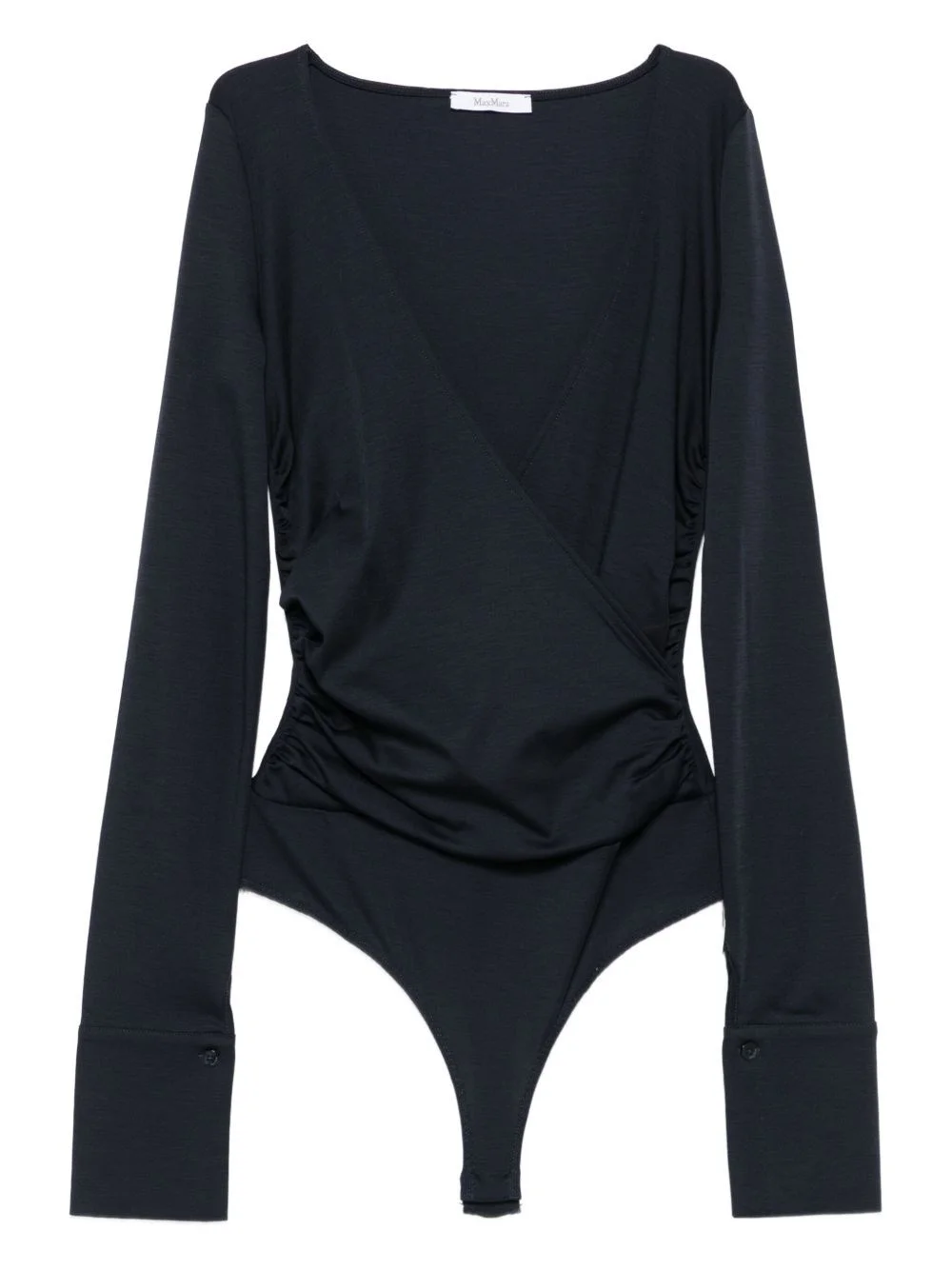 Blue bodysuit in pure wool jersey. Crossed V-neck. Long sleeves with high shirt cuffs. Snap button closure on the bottom. product code: 2521946069600004 NIGELLA COMPOSITION 100% wool MADE IN ITALY