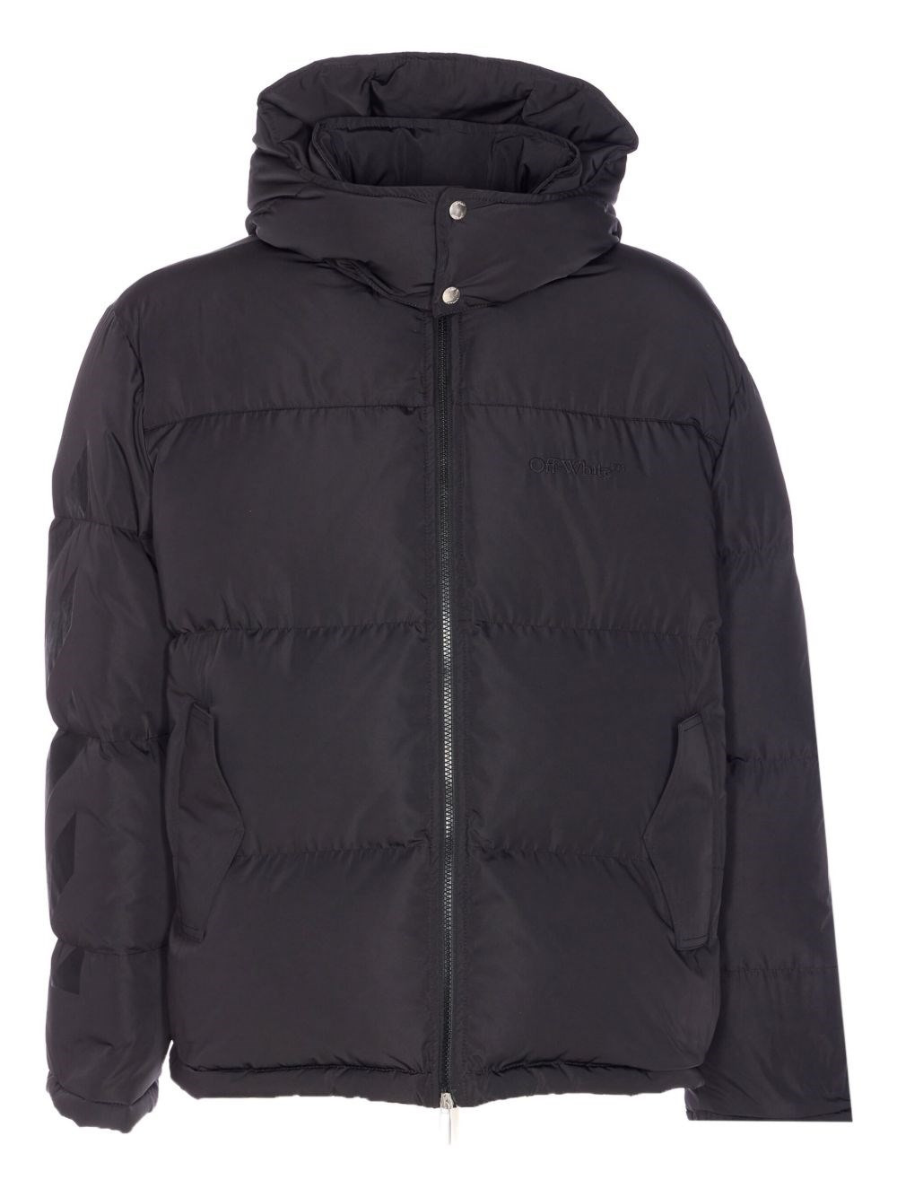 Black hooded down jacket with zip closure and zipped pockets. Tone-on-tone Arrows logo print on the back. product code: OMED066F25FAB0011010 COMPOSITION Made in Italy 100% polyester 100% goose down