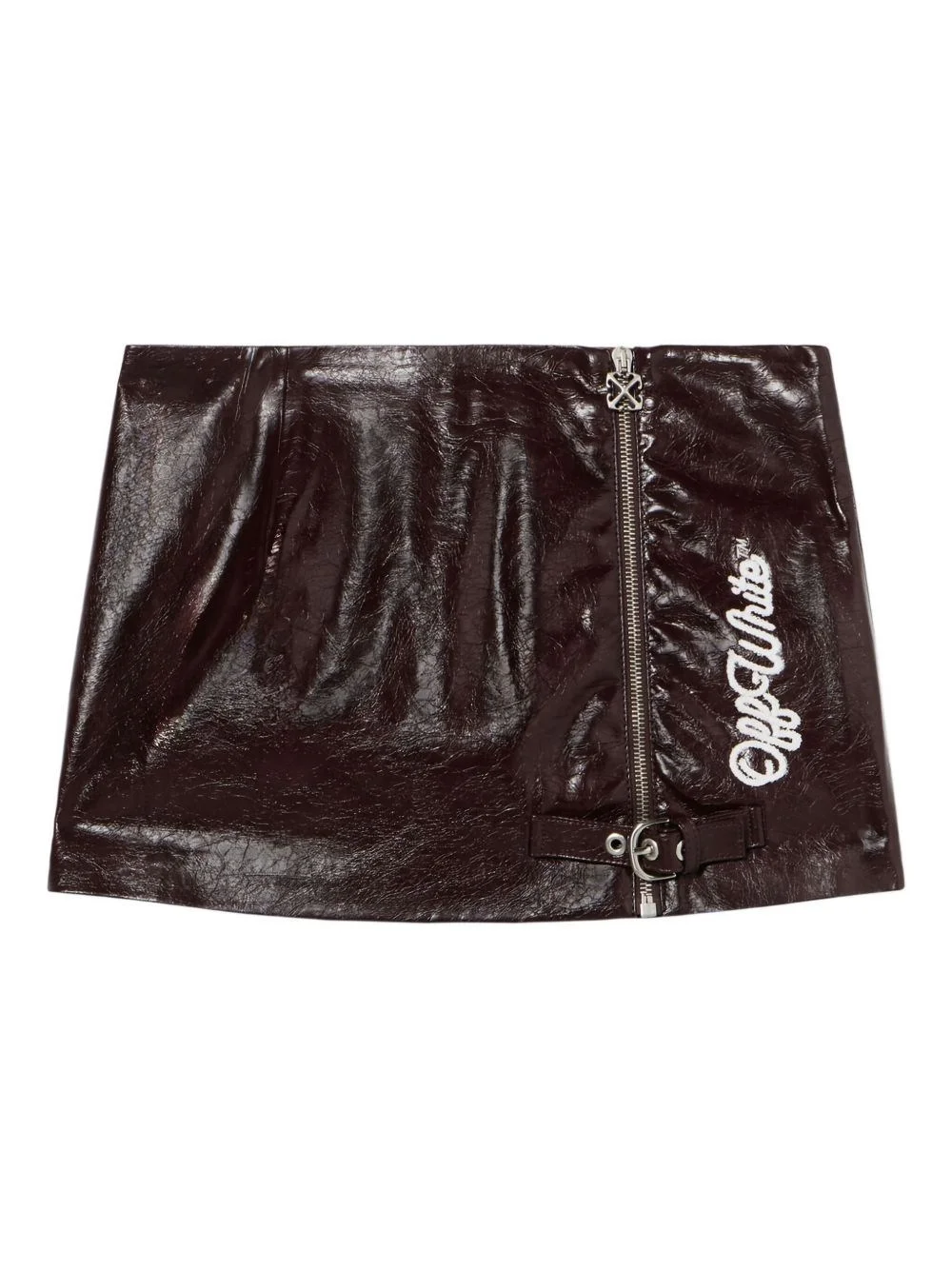 Mini skirt in shiny imitation leather. Embroidered logo detail. Side zip closure and buckle on the bottom. product code: OWCU01GF25FAB0016E01 COMPOSITION polyurethane 52%, viscose 37%, polyester 6%, synthetic fiber 5% MADE IN ITALY