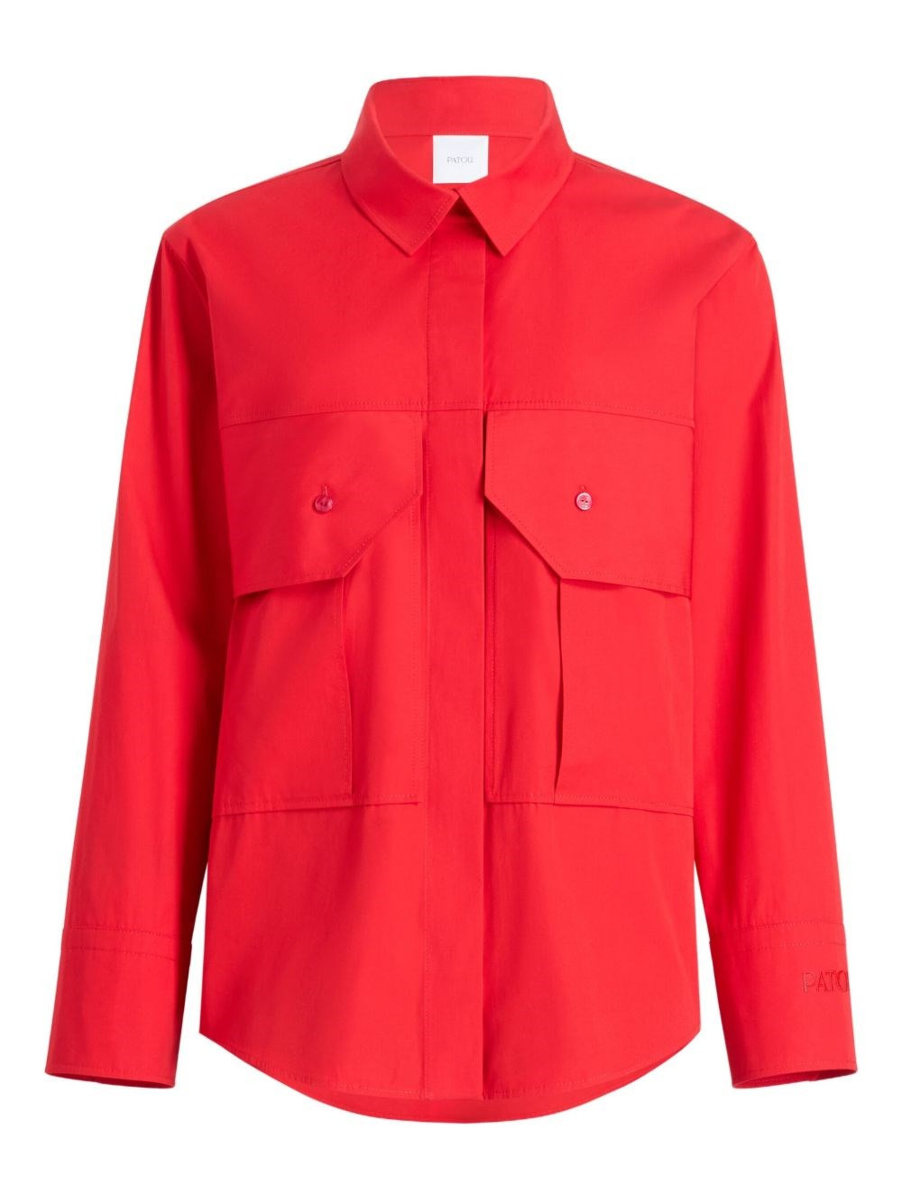 Elixir Red bio poplin blouse. Silhouette straight side. Classic shirt collar. Front closure with concealed buttoning. Large chest pockets with flap. Patou logo embroidered on the left cuff. product code: BL0520017314R COMPOSITION 100% organic cotton MADE IN MADAGASCAR