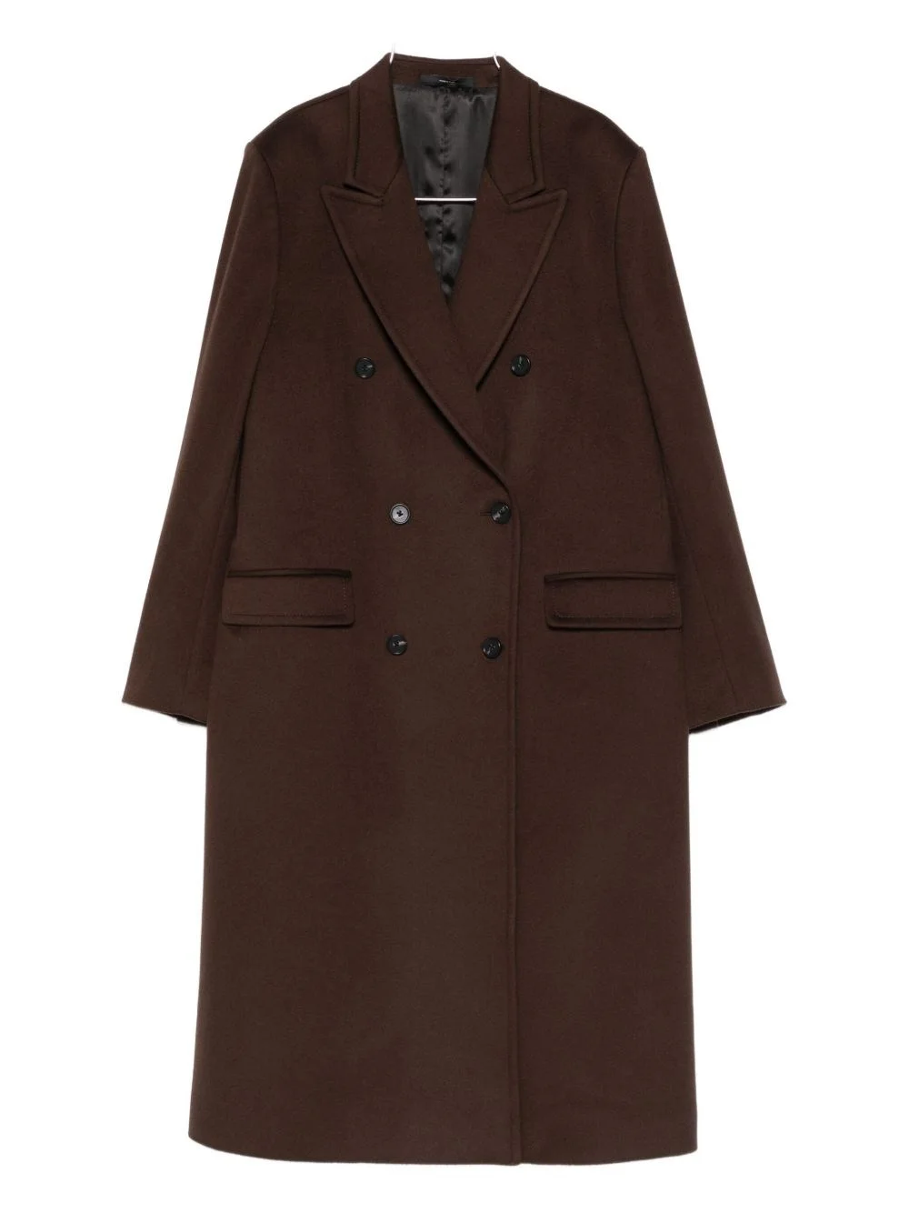 Double-breasted brown wool and cashmere coat. Side welt pockets. Concealed buttons on the front. Rear split. product code: W1R359CAT0011069A COMPOSITION 90% wool, 10% cashmere MADE IN PORTUGAL