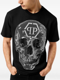 Black T-shirt with short sleeves and contrast front print with rhinestone applique and logo. product code: FAECMTK844002BLACK COMPOSITION Made in Turkey 100% cotton