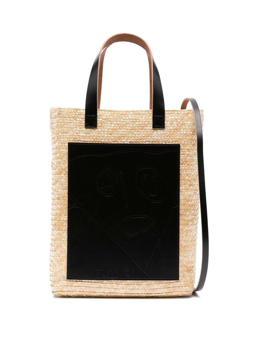 Wheat straw bag with white black leather patch. Adjustable and removable shoulder strap. Flat handles. Inner cotton case with cotton cord drawstring. product code: SHCBF02F00PF00100Y20 COMPOSITION straw 90%, leather 9%, metal 1%; Lining: 77% cotton, 23% nylon MADE IN ITALY SIZE & FIT Height: 30 cm; Width: 22 cm; Depth: 11 cm.