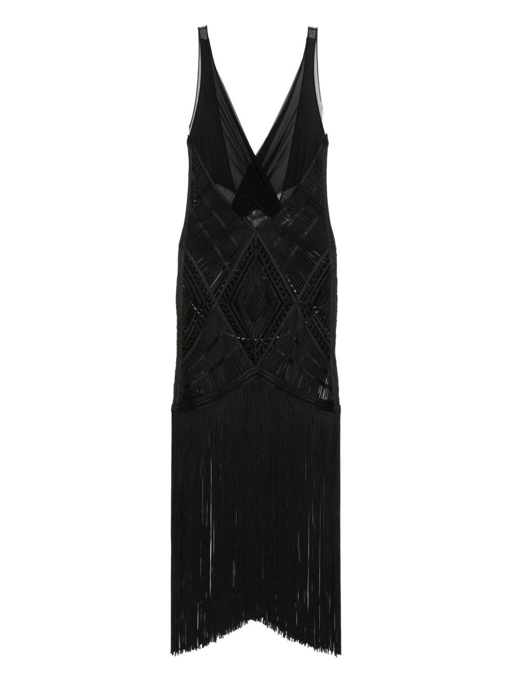 Embroidered tulle midi dress with geometric pattern and fringed hem. Back zipper closure. product code: 251WCW00240PAA108RA100 COMPOSITION 100% polyamide, 100% viscose MADE IN ITALY