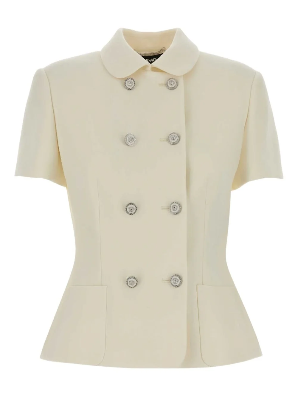 Double breast jacket in double wool crepe with short sleeves and "fitted" fit. Medusa button closure. Structured shoulders. Front patch pockets. product code: 10230621A127891W010 COMPOSITION 100% pure virgin wool; Lining: 100% cupro MADE IN ITALY