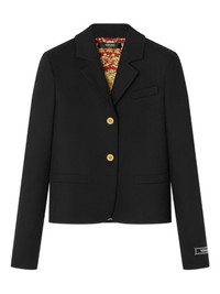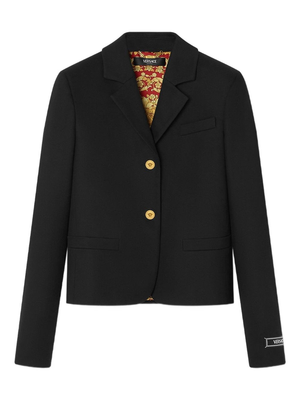 Single breasted cotton gabardine short boxy jacket lined with Barocco print and Versace tailored jacquard label on the sleeve. product code: 10203141A152641B000 COMPOSITION 100% cotton; 100% cupro; Lining 2: 100% polyester MADE IN ITALY
