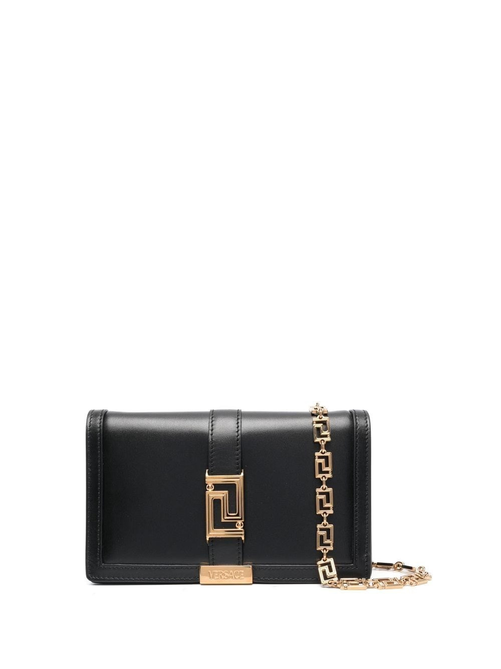 Smooth black leather bag. Golden chain removable crossbody bag with Greek. Inner lining with zip pockets, four card compartments and onefors... Snap button closure. product code: 10072201A051341B00V COMPOSITION 100% leather MADE IN ITALY