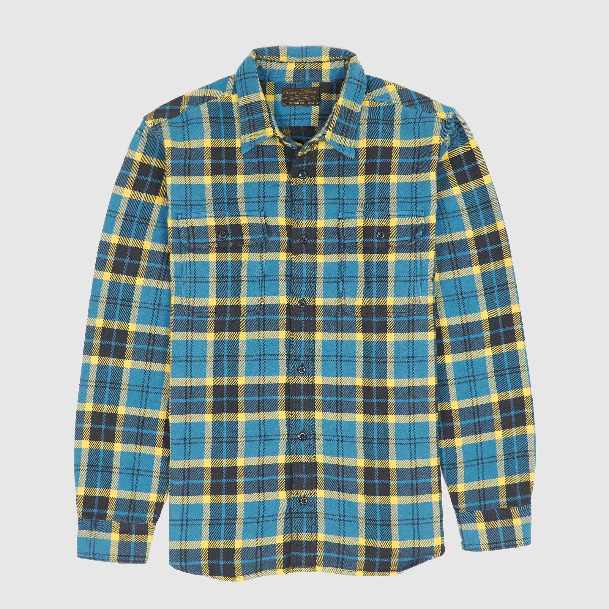 Soft, but heavyweight blanked cotton flannel plaid outdoor lumberjack jacket. Functional pockets and a straight cut with press button closure. This Filson product is washed for an extra soft feel. Relaxed fit Sizes goes up to XXXL - 100% Heavy cotton flannel - Pointed collar - Two slanted hand pockets - Three chest patch pockets - Two interior pockets - Press button closure - Garment washed