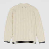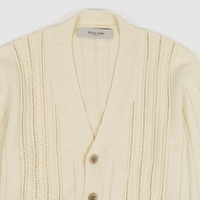 Inspired by the vibrant energy of the 90s, this cardigan, made from cozy cotton in a soft lived-in white, is a standout piece. It's got a unique braided design on the front, and the dark striped ribbed cuffs on the bottom and sleeves give it that extra touch of style. Fits slightly oversized - 100% cotton yarn - Knitted cable pattern - Front five button closure - Dark blue striped on the hem and the end of the sleeves - Made in Italy