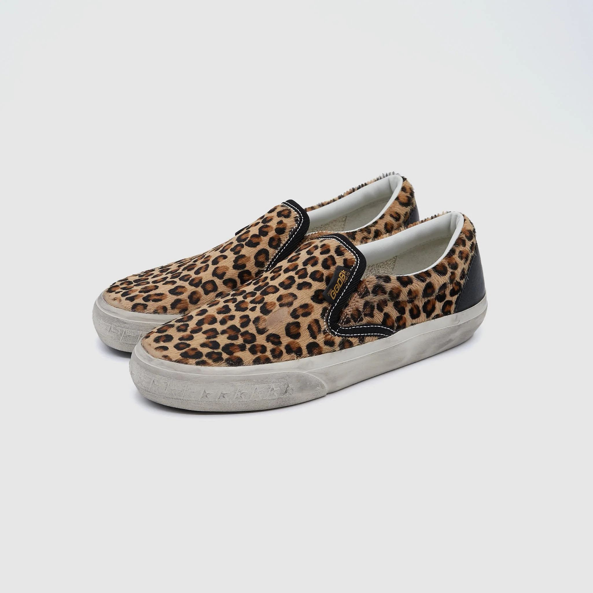 VCE speaks a simple language. It's inspired by the carefree image of California skate culture. The slip-on design is comfortable, versatile, and easy to move in. This model has a rubber toe and a pony skin upper in beige and brown leopard print, with a black leather heel tab. Fits true to size:Europeans sizes - Upper: 100% cow leather - Lining: 39% cotton, 38% polyurethane textile, 15% polyester, 8% viscose - Sole: 100% rubber - Beige and brown leopard-print pony skin upper - Black leather heel tab - Lived-in finish - "VCE" soft insole - Stars on the sole - "Golden Goose" embossed on the heel - Hand made in Italy
