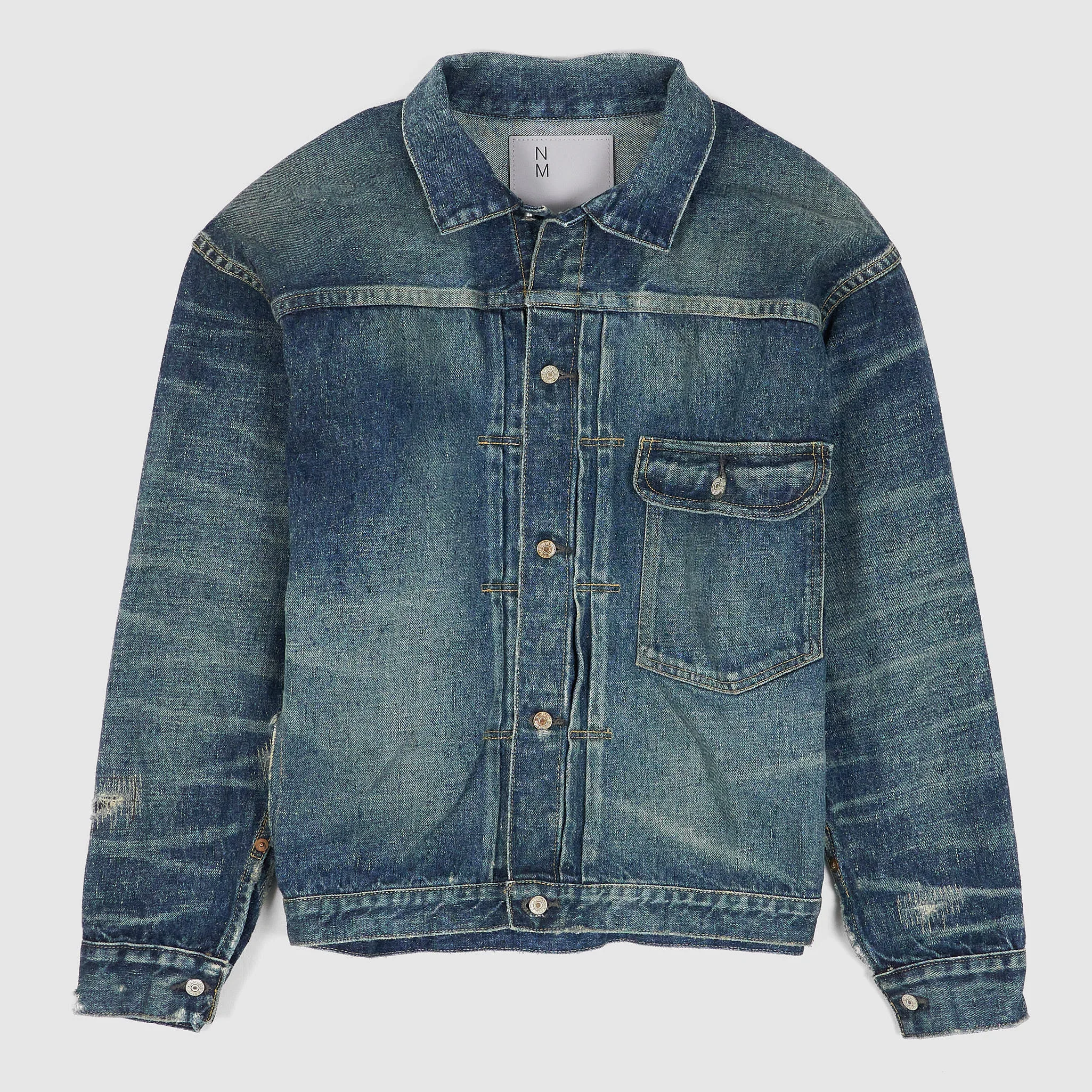 The New Manual Men's Selvedge Denim Jacket in a stone wash is a Type 1 denim jacket, meticulously crafted from high-quality selvedge denim. Garment treated for a lived-in look, it features a front flap chest pocket, cinch-back detail, and buttoned cuffs, staying true to the classic design of early denim jackets. This timeless piece offers both style and durability. Regular relaxed Fit Size S= 38" Size M= 40" - 100% Cotton - Selvedge denim - Type 1 denim jacket with front flap chest pocket - Cinch-back detail, buttoned cuffs - Garment treated for a worn-in look - Made in Japan