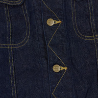 This denim trucker jacket is crafted from 11.5oz indigo denim, offering a classic and durable look. Designed with a regular fit, it features a point collar, button front closure, and buttoned chest flap pockets. The jacket is detailed with buttoned cuffs and back buttoned waist tabs for an adjustable fit, and finished with signature Bone embroidery for a unique touch. Fits small 46" = Small to Medium 48" = Large - 11.5oz indigo denim - Point collar - Button front closure - Buttoned chest flap pockets - Buttoned cuffs, back buttoned waist tabs - Signature BONE embroidery - Made in Japan