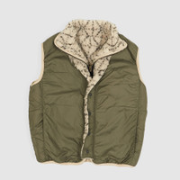 Printed reversible soft fleece waistcoat. A perfect lightweight vest for the colder season with a unique and outstanding look. Revers comes in army green nylon for comfort and versatility. Roomy front and back pockets. Made in two fancy colors. Fitting is unisex size 1 = small to medium ladies oversized size 4 = medium to x- large men size - High neck closure - Chest zipped pocket, two front zipped pockets, elasticated trims, - Two internal pockets - Zip and snap fastenings - Fleece 100% polyester; - Lining 100% nylon - Made in Japan