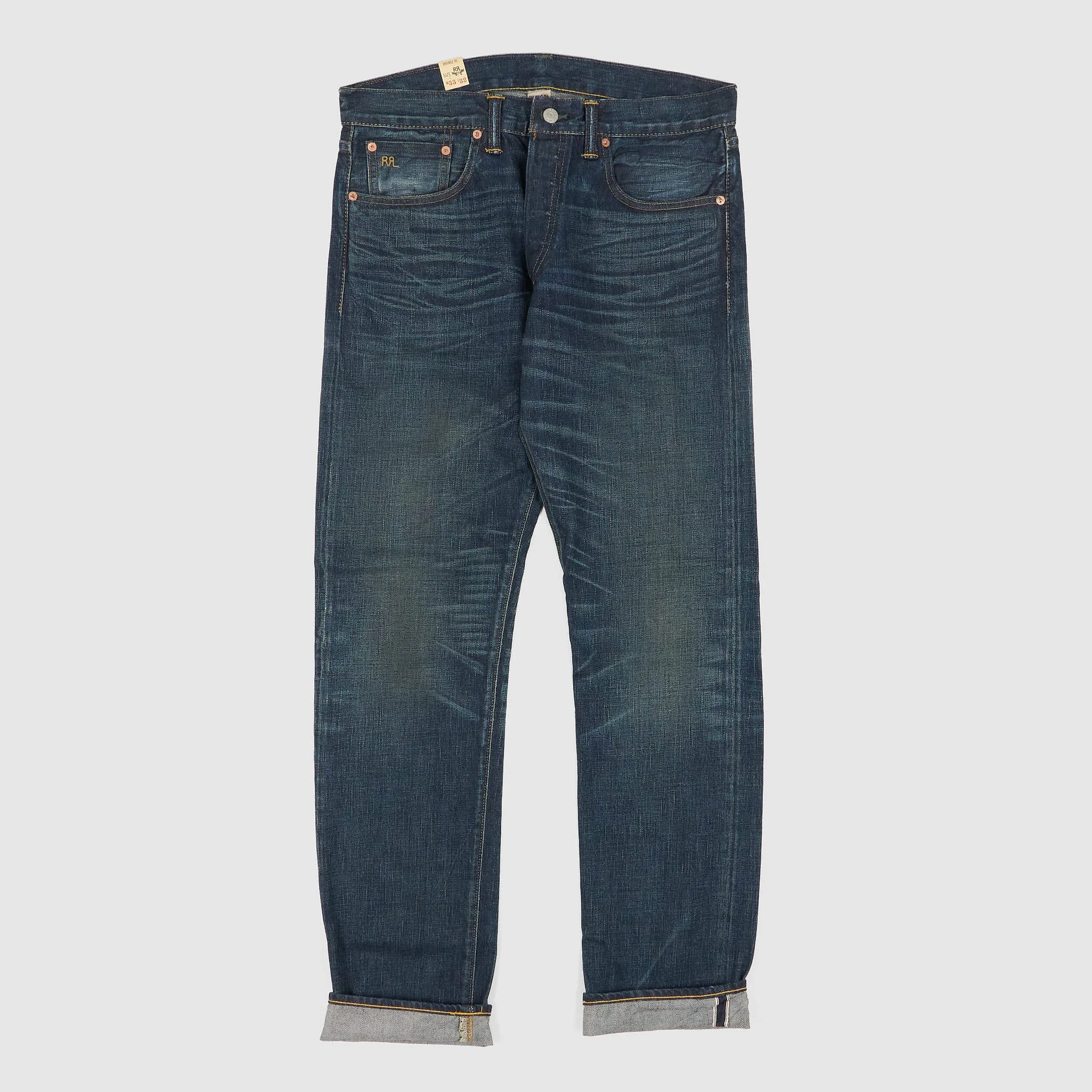Made in America from Tennessee grown cotton. The yarn is ring-spun in Japan. Rope dyed with natural indigo. Exclusive to Double RL, woven on vintage shuttle looms to create 15.92 oz. right-handed twill. Selvage construction, inspired by the denim of the 30s. Hand-finished in a process that involves up to 50 individual steps. Specialized tools and techniques are used. Slim fitted silhouette with a straight leg opening - 100% cotton - Hand-set chain-stitched waistband with inserted belt loops for added durability - Button fly - American-made buttons, rivets, and washer burrs - Five-pocket styling - "RRL" embroidery at the selvage coin pocket - Natural twill pocket lining - Leather patch on back - Made in USA with Japan denim