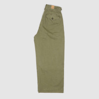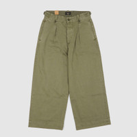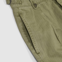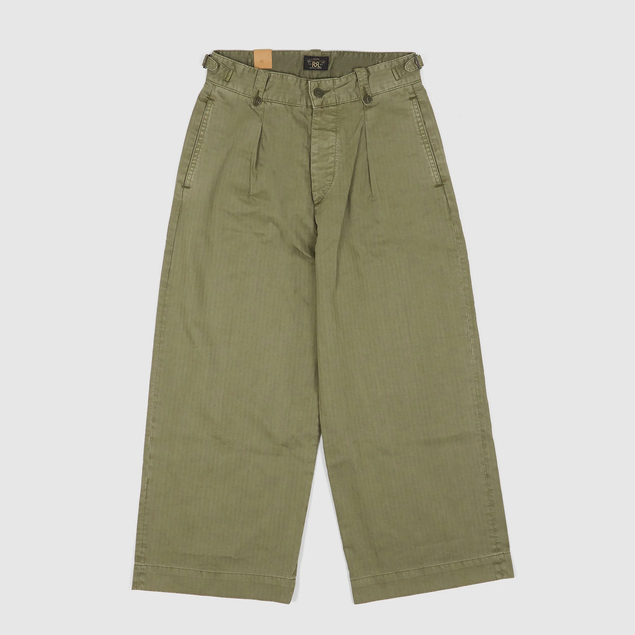 1940s-inspired cropped pants. Crafted from Japanese piece-dyed cottonherrinbone twill. Featuring hand-set back flap pockets and stitched pleated front. Belt loops with buttons and adjustable tabs at the sides. Stonewash finish. Fits true to size in a relaxed silhouette - 100% cotton - Button fly with a buttoned closure - Corozo buttons - Pleated front - Two side on-seam pockets - Two buttoned back pockets. - Adjustable buckled tabs at the waist - Buttoned belt loops