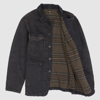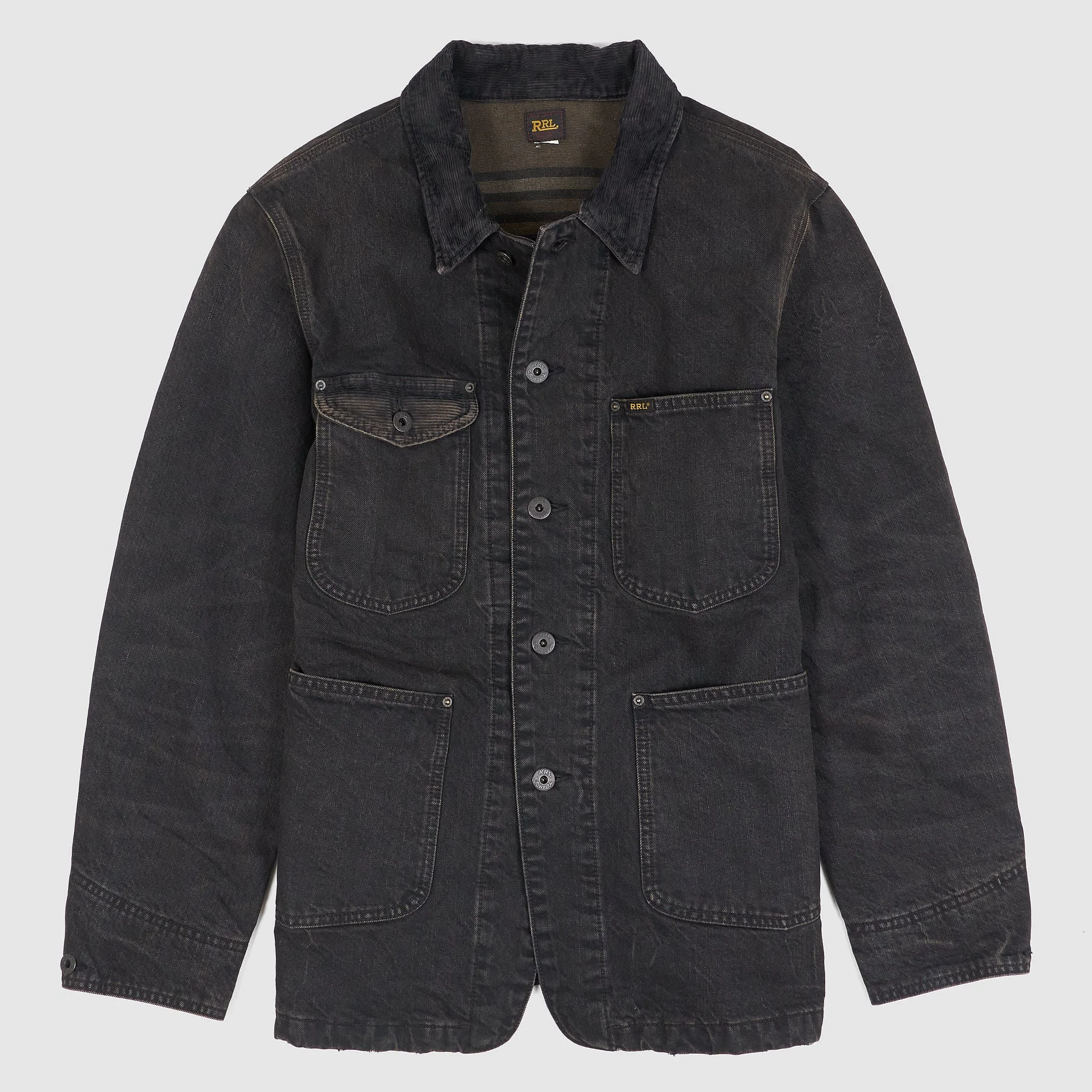 This jacket has been crafted from 13.6 oz. of denim, drawing inspiration from the practicality and functionality of workwear. The jacket features a corduroy collar and cuff facings. The interior is lined with brushed cotton and features a yarn-dyed striped pattern. The product has been washed and pigmented to achieve an aged, vintage appearance. American made metal buttons Fits true to size - Shell and Lining 100% Cotton - Corduroy straight collar - Buttoned placket - American-made metal buttons - Buttoned cuffs with corduroy facing - Left chest patch pocket with a “RRL” label - Right chest buttoned pocket with corduroy facing at the flap - Two front waist patch pockets. Interior right chest pocket - Fully lined with striped brushed cotton