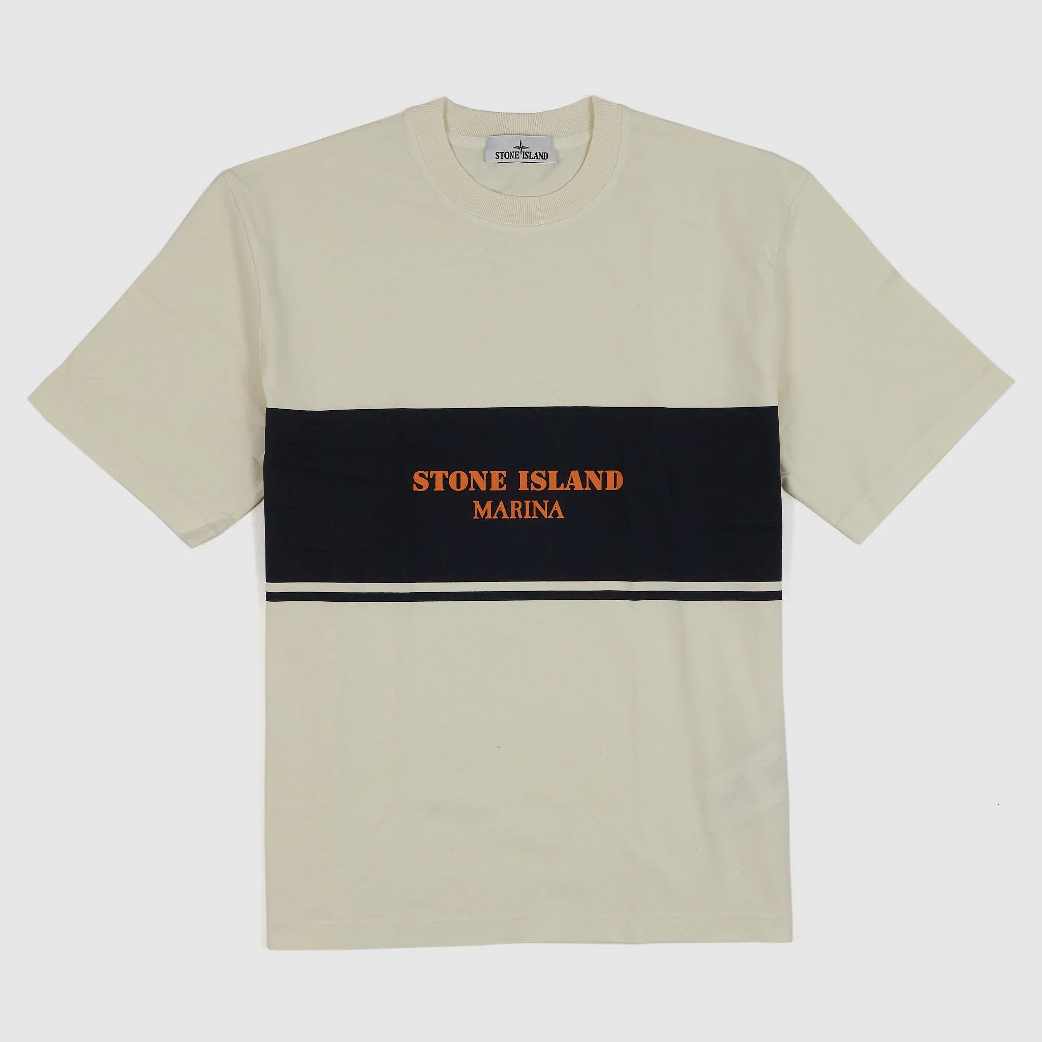 Crafted from premium piece-dyed combed cotton jersey, this short-sleeve tee offers exceptional softness and durability. The oversized fit provides a contemporary silhouette, while the ribbed crew neck adds structure. A tonal band print on the front features the iconic Stone Island Marina lettering in contrasting color for subtle branding. Oversized fit - 100% combed cotton jersey (main fabric) - 100% cotton ribbed neckline - Piece-dyed for rich, lasting color - Contrast Stone Island Marina band print