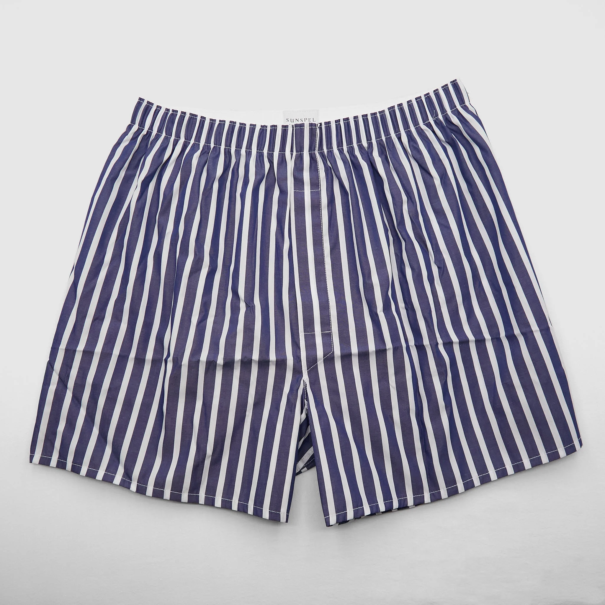 Sunspel introduced the boxer short to Britain in 1947 and perfected its design. Today, with only minor updates, we continue to produce boxer shorts to our original specifications. Made from 100% long-staple fine cotton, they offer unmatched lightness, softness, and breathability. The double-turned, feldlocked seams and distinctive back panel ensure a smooth, comfortable fit. Fits true to size. - 100% Long-staple fine cotton - Double-turned, feldlocked seams - Distinctive back panel for comfort - Made in England