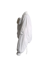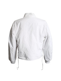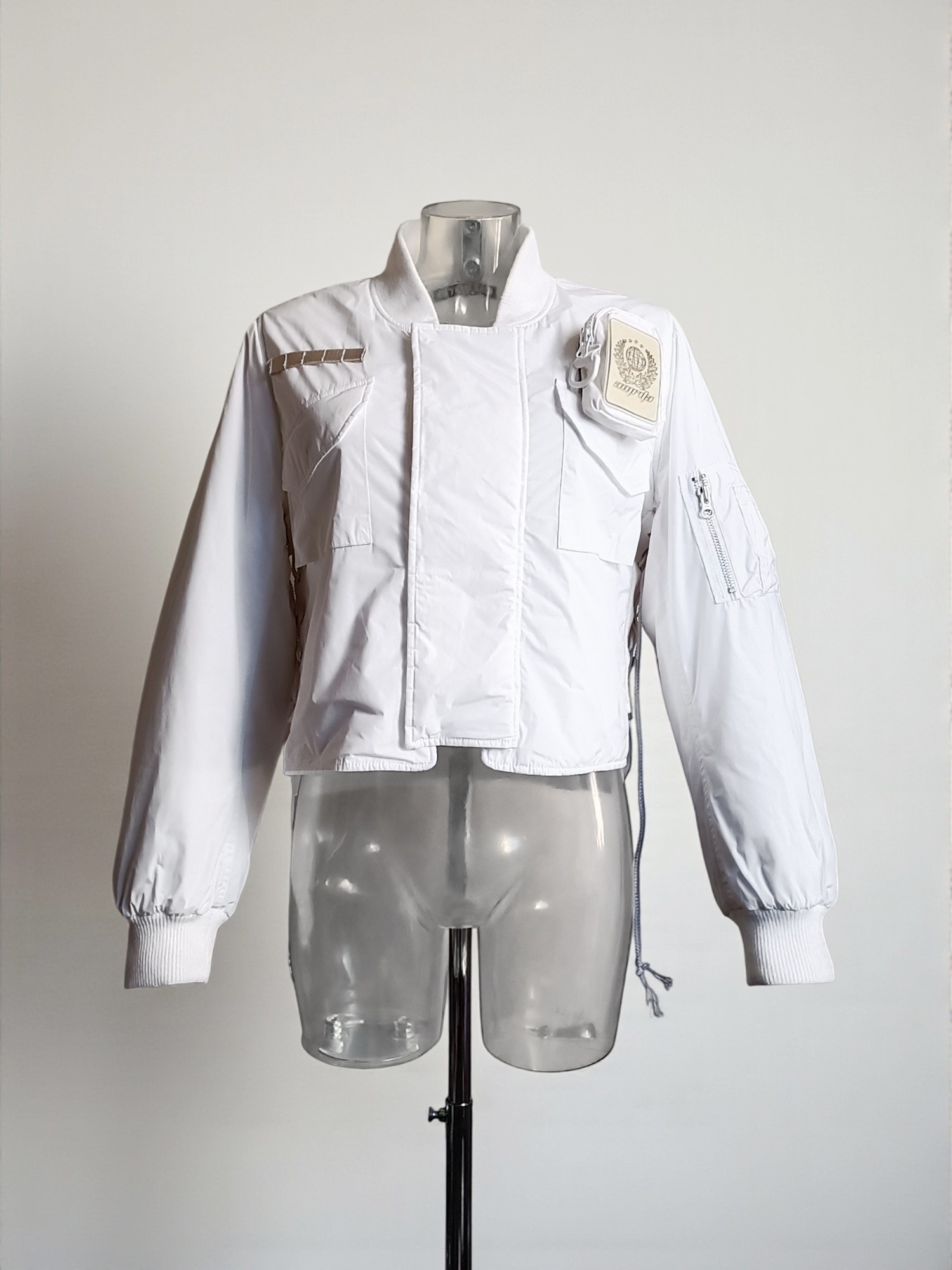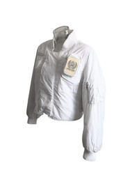 Minimal bomber jacket in blanc cassé nylon. A contemporary take on a classic silhouette, the jacket features a velcro operated detachable cigarette pouch, big enough for king-sized cigarettes. Thick and asymmetric nylon inset over placket, oversized chest pocket, fully functional utility pocket, and herringbone inset evoke the functional structure and aesthetic of a classic military garment. Drawstrings at hem, as well as ribbed collar and sleeves. Soldout everywhere. [ Product details ] - Fits TTS - Regular Cropped Fit - Oversized - Fabric : 100% Polyester - Dry Clean Only - Do Not Bleach - Imported - Made in Korea • Size: 1 (XS/S) • Condition: Close to unused. Pre-owned. • MSRP: $631.00 USD + tax Ready-to-ship worldwide via premium carriers (DHL Express, FedEx, UPS) within 24 hours after payment cleared. *Instruction for International Buyers: Estimated Delivery: About 5~10 days with Tracking Number. Import duties, taxes, and charges are included in the item price. #혜인서 #hyeinseo #bomberjacket #cream #minimalaesthetics #minimalfashion #newjeans #kfashion #koreanfashion #y2k #avantgarde #cigarettepouch #unisex #deibido #reversibleexclusive #beigeaesthetics