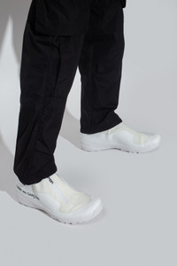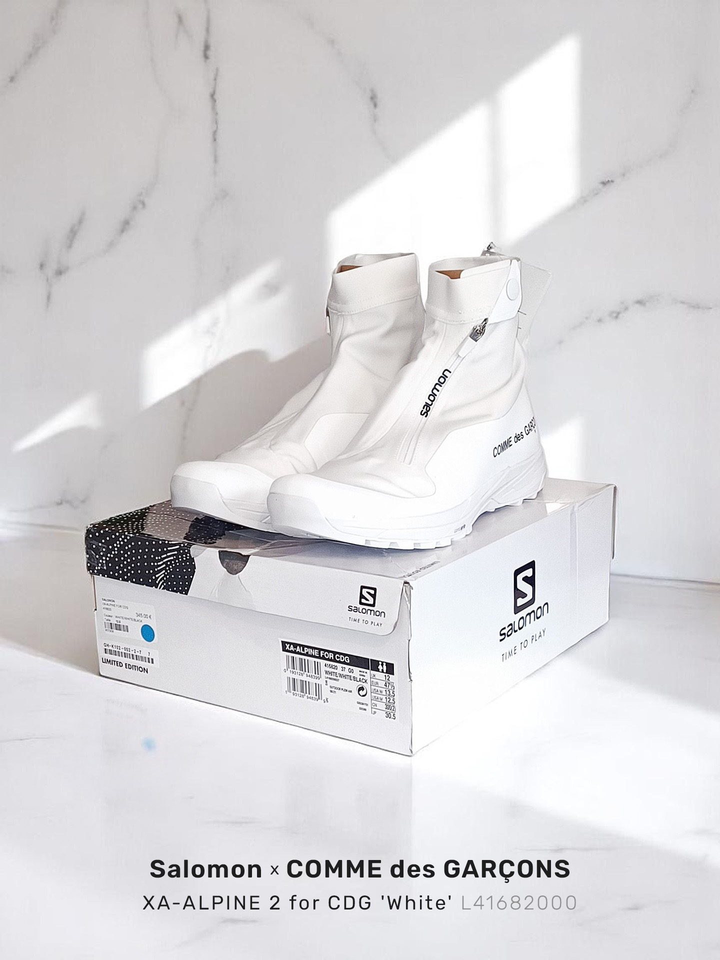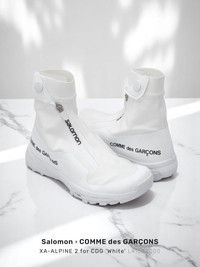 Unisex sock-style sneakers designed as part of the Comme des Garçons Homme × Salomon collab revisiting the iconic XA-ALPINE 2 ADVANCED silhouette. These remarkable carbon-plated high-top water-repellent protective sneakers are flawlessly matching with the sculptural rubber midsoles showcasing the Contagrip® tech in order to overcome grounds under all conditions. The CDG x Salomon XA ALPINE 2 ADV are composed by high-performance fabric that are incredibly lightweight. [ Product details ] · Upper: Polyuréthane/Nylon · Sole: 100% Rubber. · Contrasted CDG logo. · Zipper: Elastic collar with snap fastening. • SKU: L4168200037 • Size: UK 12 / US 12.5 / EUR 47⅓ Men's • Colorway: White / Blanc Cassé / Black • Collection: Comme des Garçons Fall 2021 RTW • Condition: Brand New with OG Box • Release date: 28/10/2021 • RRP: € 345.00 Ready-to-ship worldwide via UPS within 24 hours after auction closed. *Instruction for International Buyers: Estimated Delivery: About 5~10 days with Tracking Number. Import duties, taxes, and charges are included in the item price. #salomon #xaalpine #slab #cdg #collabs #commedesgarcons #salomonforcdg #minimal #whiteaesthetics #techwearshoes #trekking #trail #outdoorlife #limitededition #luxury #french #unisex #deadstock #deibido
