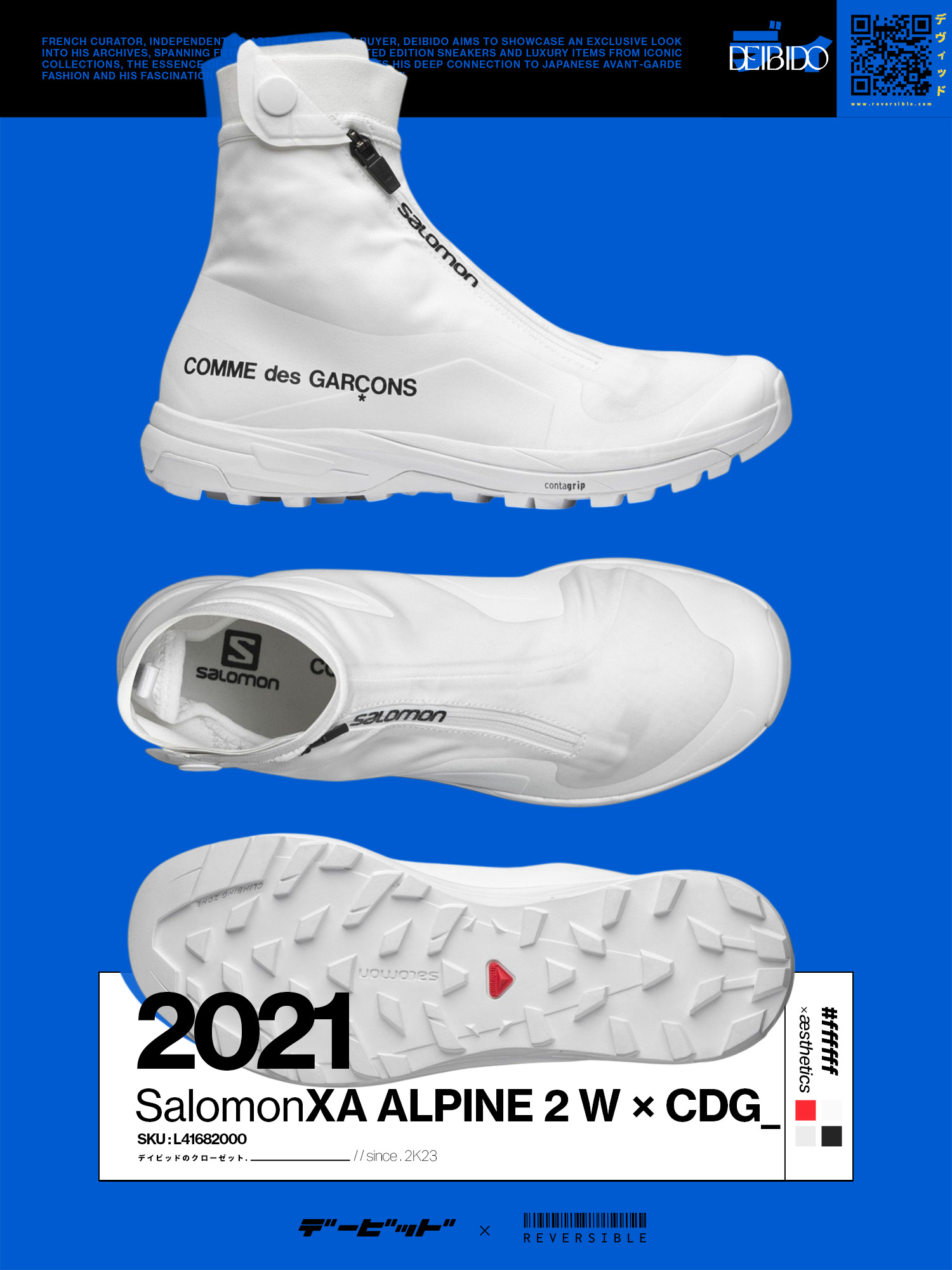 Unisex sock-style sneakers designed as part of the Comme des Garçons Homme × Salomon collab revisiting the iconic XA-ALPINE 2 ADVANCED silhouette. These remarkable carbon-plated high-top water-repellent protective sneakers are flawlessly matching with the sculptural rubber midsoles showcasing the Contagrip® tech in order to overcome grounds under all conditions. The CDG x Salomon XA ALPINE 2 ADV are composed by high-performance fabric that are incredibly lightweight. [ Product details ] · Upper: Polyuréthane/Nylon · Sole: 100% Rubber. · Contrasted CDG logo. · Zipper: Elastic collar with snap fastening. • SKU: L4168200037 • Size: UK 6.5 / US 8 / EUR 40 Women's • Colorway: White / Blanc Cassé / Black • Collection: Comme des Garçons Fall 2021 RTW • Condition: Brand New with OG Box • Release date: 28/10/2021 • RRP: € 345.00 Ready-to-ship worldwide via UPS within 48 hours after payment cleared. *Instruction for International Buyers: Estimated Delivery: About 5~10 days with Tracking Number. Import duties, taxes, and charges are not included in the item price. #salomon #xaalpine #slab #cdg #collabs #commedesgarcons #salomonforcdg #minimal #whiteaesthetics #techwearshoes #trekking #trail #outdoorlife #limitededition #luxury #french #unisex #deadstock #deibido