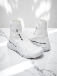 Premium sneakers designed as part of the Comme des Garçons Homme × Salomon collab revisiting the iconic XA-ALPINE 2 ADVANCED silhouette. These remarkable carbon-plated high-top water-repellent protective sneakers are flawlessly matching with the sculptural rubber midsoles showcasing the Contagrip® tech in order to overcome grounds under all conditions while wearing them. The CDG x Salomon XA Alpine 2 ADV are composed by high-performance fabric that are incredibly lightweight. [ DETAILS ] · Upper: Polyuréthane/Nylon · Sole: 100% Rubber. · Contrasted CDG logo. · Zipper: Elastic collar with snap fastening. • Size: UK 12 / US 12.5 / EUR 47⅓ Men's • SKU: L4168200037 • Colorway: White / Blanc Cassé / Black • Collection: Comme des Garçons Fall 2021 RTW • Condition: Brand New with OG Box • Release date: 28/10/2021 Ready-to-ship worldwide via UPS within 48 hours after payment cleared. *Instruction for International Buyers: Estimated Delivery: About 5~10 days with Tracking Number. Import duties, taxes, and charges are included in the item price. #salomon #xaalpine #slab #cdg #commedesgarcons #salomonforcdg #minimal #whiteaesthetics #techwearshoes #trekking #trail #outdoorlife #limitededition #luxury #french #unisex #deadstock #deibido #reversibletechwear #collabs