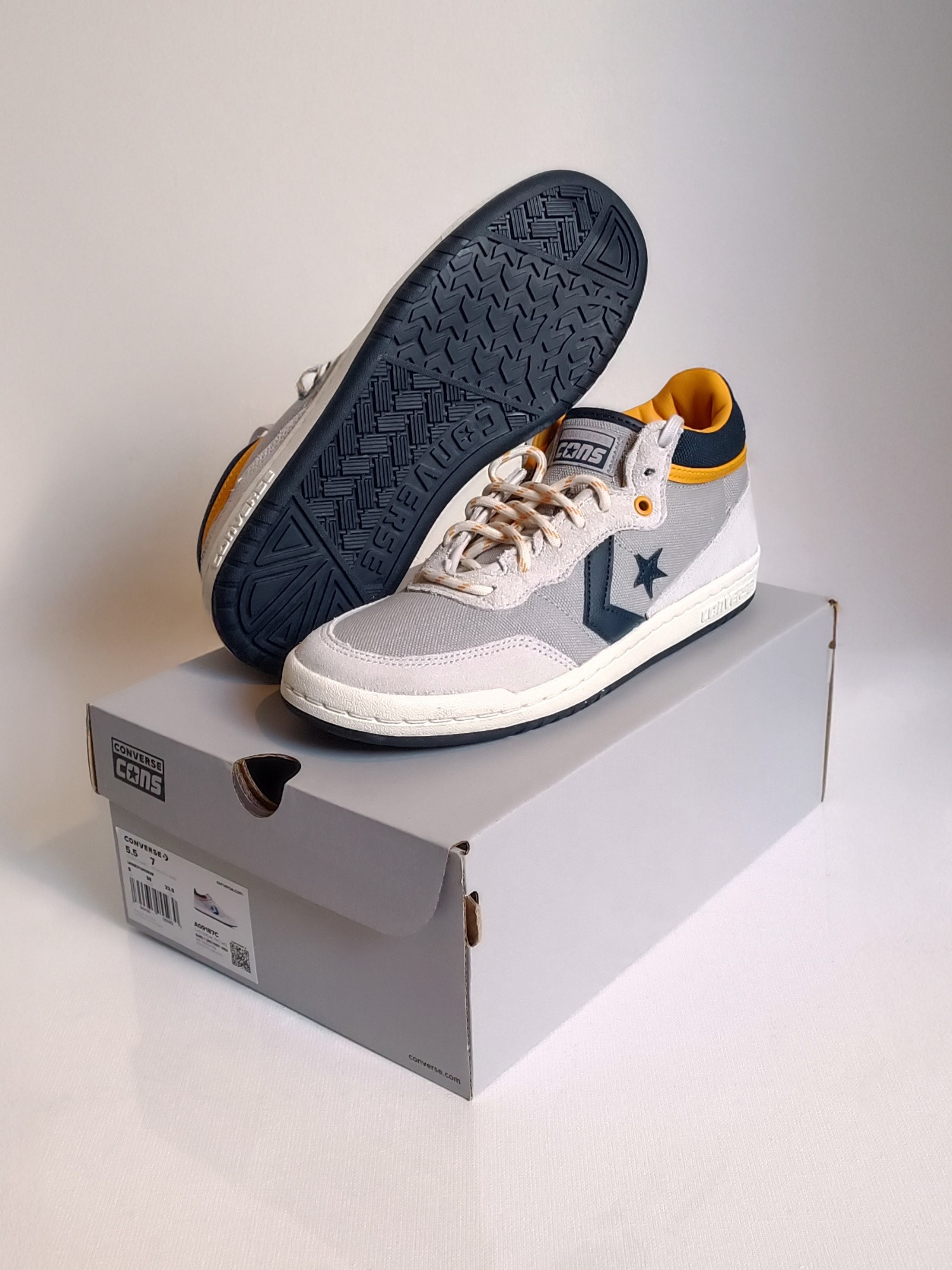 Mid-top canvas and suede sneakers in gray. · Lace-up closure · Logo patch at padded tongue · Padded collar · Logo appliqué at sides · Logo printed at heel tab · Cushioned CX foam footbed · Buffed leather and canvas lining · Logo embossed at midsole · Treaded rubber sole • SKU: A09187C • Size: US 7 / EUR 38 Women's • Supplier color: Barely Grey • Condition: Brand new with OG Box • Collection: Spring/Summer 2024 • MSRP: €80,00 EUR Ready-to-ship worldwide via premium carriers (DHL Express, FedEx, UPS) within 24 hours after payment cleared. *Instruction for International Buyers: Estimated Delivery: About 5~10 days with Tracking Number. Import Duties/VAT/Customs fees, are not included in the item price. #converse