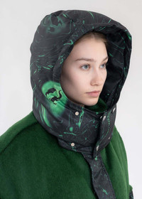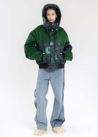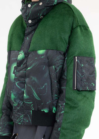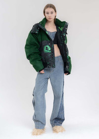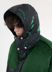 FENG CHEN WANG Green and navy blue Lacquerware Graphic-print Hodded Puffer Padded Jacket. Features a mohair and lacquer surface construction. Concealed fastening along the front face. Integrated hood with press-stud fastening. Zippered pocket at the left sleeve. Slit pockets at the waist. Finished with an elasticized waistband and tonal stitching. - Unisex - Oversized Fit - Fits true to size - 100% Polyester - Paneled construction - Detachable hood at funnel neck - Concealed zip closure - Welt pockets - Rib knit hem and cuffs - Partial logo-woven satin lining - Models are wearing a size S • SIZE: S • CONDITION: BRAND NEW • RETAIL: $1,266.00 USD • WORLDWIDE SHIPPING ✅ All orders are shipped via UPS within 1-3 days after payment cleared.