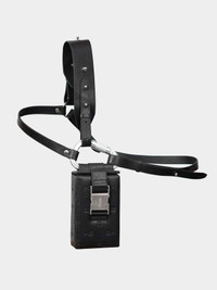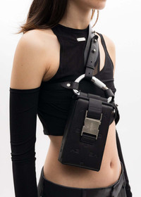 HELIOT EMIL™ AW20 'AMORPHOUS SOLID' Buckle-detail structured grained leather crossbody messenger 'HE' monogram sling bag in black. Features a leather belt carrying strap with carabiner clip detailing. Silver-tone quick release buckle detailing along the front face. · Adjustable and detachable post-stud harness-style strap · Black 'HE' monogram print throughout · Outer: 100% Buffalo Leather · Carabiner carry handle · Press-release closure · Accordion panel at interior · Felt lining · Logo-engraved silver-tone hardware · H6.5 x W3.75 x D2 · Imported • Supplier Color: Black • Size: OS Ready-to-ship worldwide via UPS within 24 hours after payment cleared. *Instruction for International Buyers: Estimated Delivery: About 5~10 days with Tracking Number. Import duties, taxes, and charges are not included in the item price. #heliotemil #aw20 #juulbrothers #juliusjuul #victorjuul #techwear #accessories #avantgarde #crossbodybag #phonesling #monogram #leather #darkwear #blackaesthetics #deibido #rare