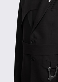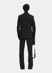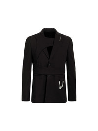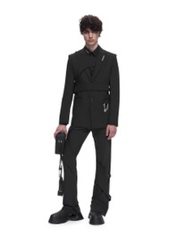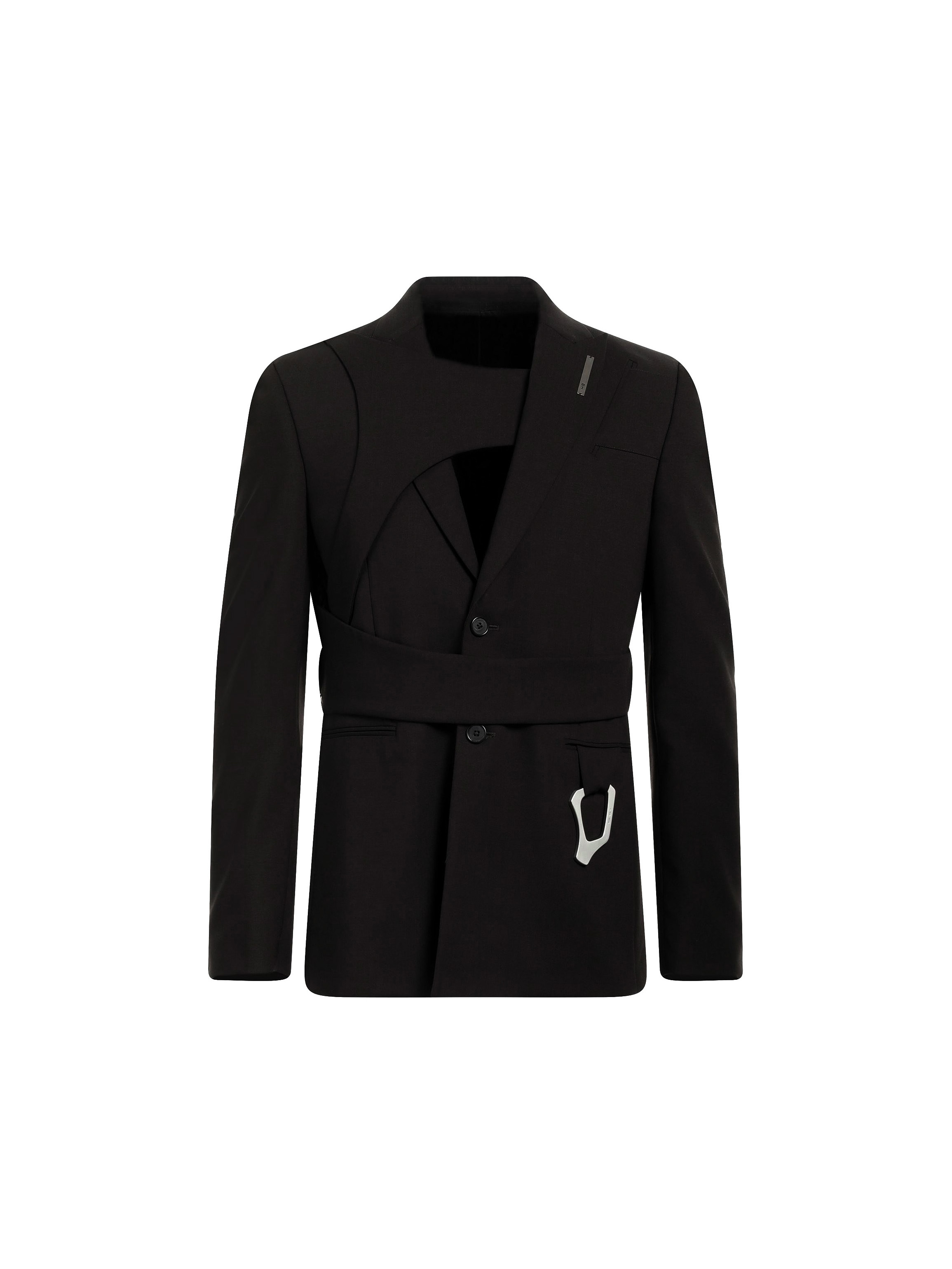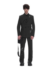Heliot Emil ™ Autumn/Winter 2023 'Connected Forms' stretch polyester and wool-blend barathéa twill tailored blazer with integrated harness detail across chest & back, and belt going around waist closed with press buttons at side seam. Carabiner detail at front left pocket. • DETAILS · Regular fit · Polyester wool fabric · Heliot Emil ™ recycled polyester jacquard lining · Integrated harness at front and back · Peak lapel · Two jet pockets · Three internal pockets · Two-button fastening at front · Functioning buttoned cuffs · Straight front hem · Carabiner detail at left pocket · Heliot Emil ™ metal plate logo · Custom hardware trimmings · Model is 187cm wearing size M / 48 · Made in Romania • COMPOSITION · Main Material: 53% Polyester, 43% Merino Wool, 4% Elastane · Lining: 100% acetate. • CONDITION: Brand New with tag • CARE INSTRUCTIONS: Dry Clean Only • STYLE ID: HEM04008CBR1 • SUPPLIER COLOR: Black / Chocolate Brown • SIZE: IT/FR 44 = XS • MSRP: €1.295 EUR Shipped worldwide via premium carriers (DHL Express, FedEx, UPS) within 48 hours after payment cleared. *Instruction for International Buyers: Estimated Delivery: About 7~10 business days with Tracking Number. Import duties, taxes, and charges are not included in the item price. These charges are the buyer's responsibility. Check out your country's customs office to determine what these additional costs will be prior to bidding or buying. #heliotemil #aw23 #menswear #harness #blazer #deibido #darkwear #techwear #avantgarde #blackaesthetics #blackinspo #luxury #highfashion #juliusjuul #victorjuul #エリオットエミル