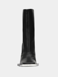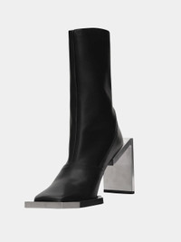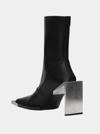 HELIOT EMIL™ Ankle-high calfskin boots in black. The METAL HEELS SERIE stand as the latest addition to the brands footwear line. A sleek captivating amalgamation of high quality nappa calf leather and raw stainless steel coalesce to craft this new style. Inspired by the brand’s core identity, this piece explores the harmonious equilibrium of the robust and soft natural resources utilized while staying true to an elegant presentation. Debuting during the SS21 runway showcase, this fusion of masterful Portuguese craftsmanship and minimalist design serves as a testament to a timeless aesthetic, supported by raw materials of the highest quality. • Size: 40 EU • Condition: Like New • Logo-engraved hardware at square toe • Zip closure at heel • Neoprene lining • Metal heel with rubber injection • Leather sole • Heel: H4 If you have any questions, please feel free to DM. Your order will be shipped in 1-3 days after payment cleared. 💬🚚💨✈️📦🌏Shipping worldwide with UPS.