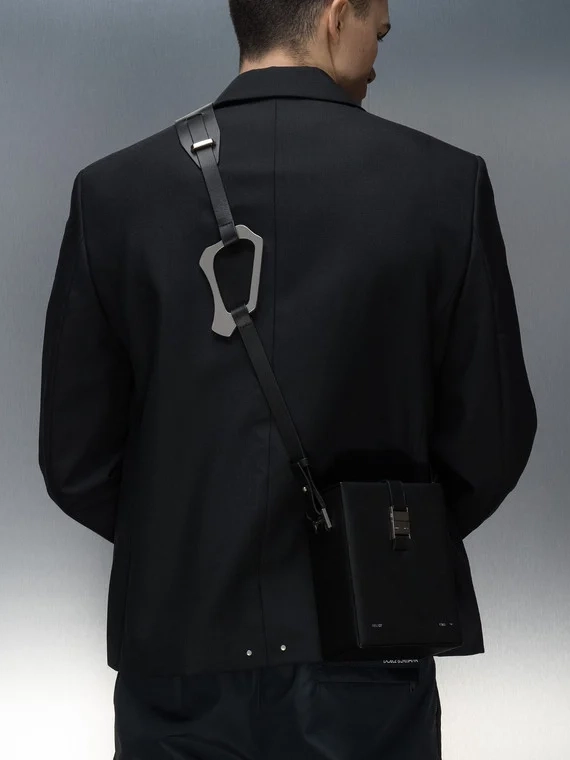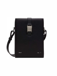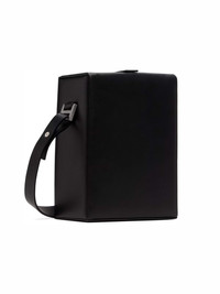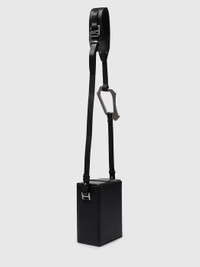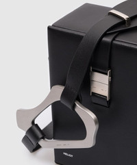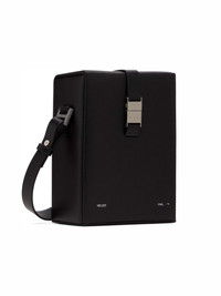 Black rigid structured crossbody bag in grained leather. w/ shoulder strap & carabiner detail. [ DETAILS ] · Logo embossing stamp at front · Logo engraved silver-tone hardware · Abstract metal element · Removable adjustable handle 56 cm high · Size (WxHxD, cm): 13.5x19x8.5 cm · Sculptural carabiner at shoulder strap · Clasp: fastex / Quick release buckle fastening · Compartments/pockets (interior): one department · Care instructions: Specialized cleaning · Interior decoration: textile · Accordion panel at interior · Suede lining · Composition: leather · Color: black Shipped worldwide with premium carriers (DHL Express, FedEx, UPS) within 3-5 days after payment cleared. #heliotemil #juulbrothers #carabiner #boxbag #blackaesthetic