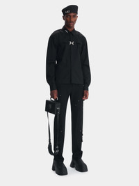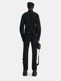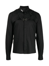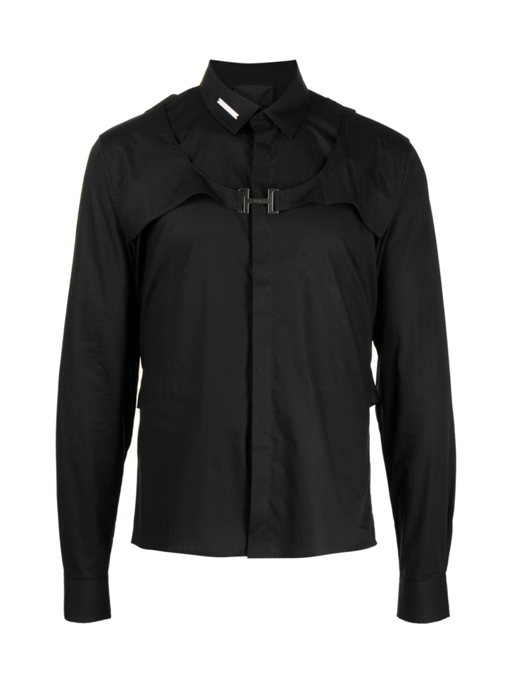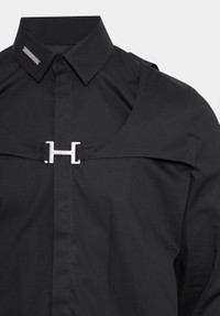 The HELIOT EMIL™ Regalia Long Sleeve Shirt comes with a regular fit and is crafted from Oeko-tex® cotton. The shirt features a harness style layer at the front attached in the center with H trim and a belt detail at the back with press buttons to adjust. Designed by Juul Brothers. • DETAILS: · Stretch organic cotton-blend poplin shirt with hidden buttons. · 'H' trim at the front strap · Heliot Emil ™ metal plate logo at collar · Integrated strap detailing throughout · Silver-tone logo hardware at spread collar · Concealed button closure · Overlay with G-hook hardware at chest · Two-button barrel cuffs · Integrated straps with adjustable press-stud fastening at back · Belt detail at the back · Supplier color: black • COMPOSITION: · 61% organic cotton / 35% cotton / 4% elastane. • RETAIL: $540 USD • MADE IN ROMANIA Shipped worldwide via UPS within 1-5 days after payment cleared.