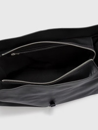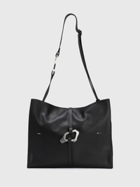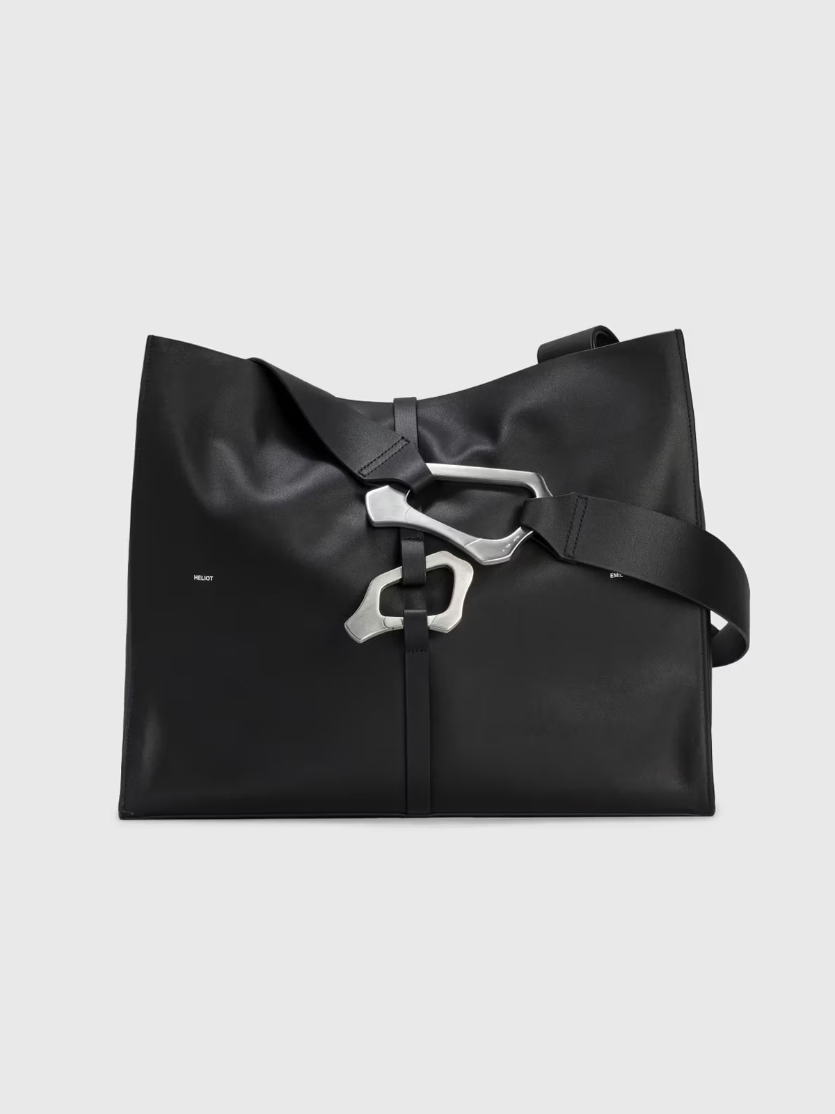 Calf-leather 'Luculent' tote bag in black, from HELIOT EMIL™. Semi-structured construction with tonal strap and logo print detailing across the front face. · Leather outer · Adjustable leather strap · Oversized and branded sculptural metal carabiners · Strap closure with zip closure for main compartment · One inner zipped pocket · Two inner sleeve pockets · Logo-engraved silver-tone hardware · Lined · Flat and reinforced bottom · Measurement: 33 cm x 39.5 cm · Depth: 12,5 cm · Strap Length: 40 cm 100% Cow Leather Imported • One Size • Supplier color: Black • Condition: Brand new with tag • MSRP: €700,00 EUR Shipped worldwide via premium carriers (DHL Express, FedEx, UPS) within 48 hours after payment cleared. *Instruction for International Buyers - Estimated Delivery: About 5~7 business days with Tracking Number. Import duties, taxes, and charges are included in the item price. #heliotemil #accessories #avantgarde #totebag #blackaesthetics #darkwear #deibido #consignment #juliusjuul #victorjuul #highfashion