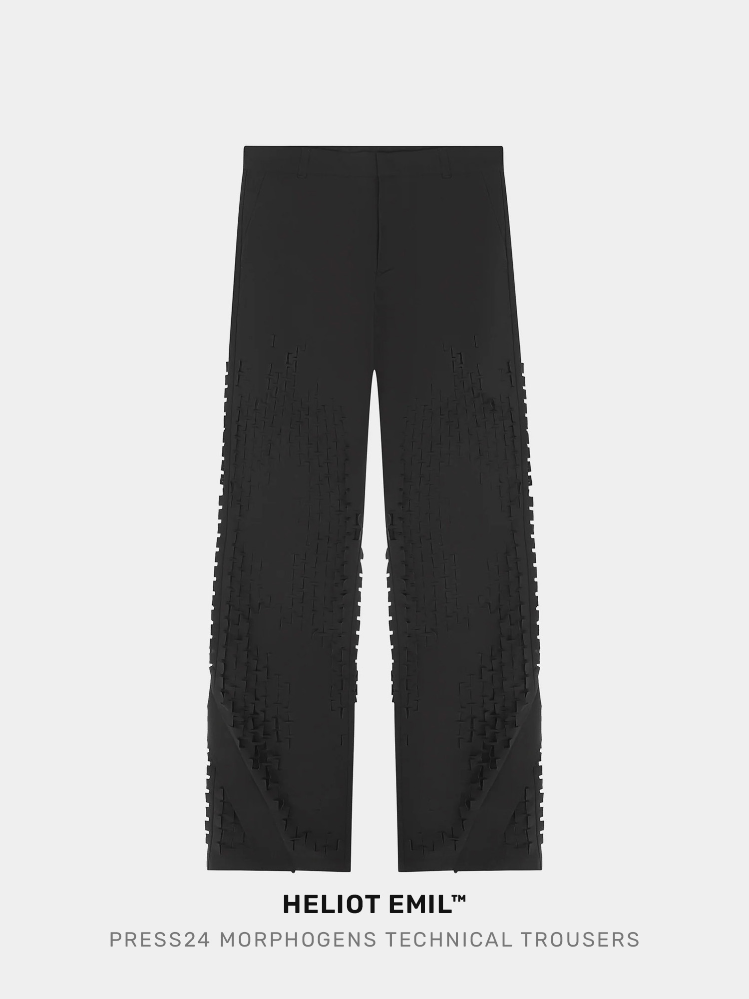 The HELIOT EMIL™ SS24 collection, titled ‘The Chemical Basis of Morphogenesis’ draws inspiration from an article by mathematician and computer scientist Alan Turing written in 1952. Here, Turing explains the algorithmic relationship between unique patterns formed in nature and mathematics. Intrigued by this, Creative Director Julius Juul sought to capture the interesting dynamic and complexity of morphogenesis in a collection that blends unique textures and patterns, with calculated mathematical approaches. The 'Morphogens' is a technical trouser made out of a lightweight polyester in a custom lasercut pattern, placed on front and back. Angled zips at hem make it possible to change the leg into a slight flare. [ Product details ] · Regular fit, unrestricted and comfortable · 100% Polyester · Supplier color: Black · Concealed front fastening · Ankle zips · Angled coil zips at bottom legs under continous zip placket · 'H'-beltloops at back waistband · Two diagonal pockets to the sides · Two rear flap pockets · Placed and panelled lasercut fabric in custom pattern · Mid-rise straight-leg trousers · Model is wearing size M / 48 [ Care instructions ] · Machine Wash Warm · Do Not Bleach · Tumble Dry · Iron On Low · Dry Clean • Size: IT 42 (Sample) • Collection: Spring / Summer 2024 • Condition: Brand New with tag • RRP: €850,00 EUR Ready-to-ship worldwide via UPS within 48 hours after payment cleared. #heliotemil #ss24 #morphogenesis #technicalpants #highfashion #concept #laser #technology #darkwear #blackaesthetics #blackinspo #techwear #avantgarde #juliusjuul #victorjuul #deibido #エリオットエミル