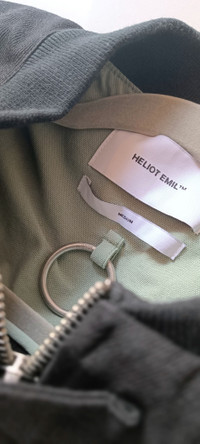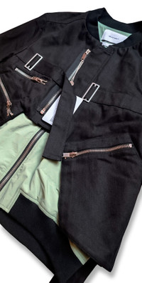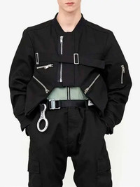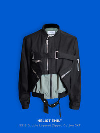 Avant-Garde Double Layered Zipped Cotton Utility Bondage Bomber Jacket (2018). HELIOT EMIL™ is helmed by Danish brothers Julius and Victor Juul who took their label's name from their great-grandfather. Since debuting their first collection at Milan Fashion Week SS17, the imprint has garnered much acclaim by mixing streetwear with progressive fashion. For each collection, the brand evokes contemporary trends with thematic inspiration. Its 2018 Spring/Summer Collection dubbed “Post-Traumatic Combat Stress" is inspired by the struggles soldiers face after returning from war. [ Product details ] - Size: Medium - Condition: Brand New - Body: 100% Cotton - Lining: 91% Nylon, 9% Elastane - Made in Portugal - MSRP: € 750.00 EUR + Tax - No restock expected. Ready-to-ship worldwide via premium carriers (DHL Express, FedEx, UPS) within 24 hours after payment cleared. *Instruction for International Buyers: Estimated Delivery: About 5~10 days with Tracking Number. Import duties, taxes, and charges are included in the item price. #heliotemil #juulbrothers #limitededition #archive #reversibletechwear #techwear #ss18 #bomberjacket #layered #darkwear #avantgarde #blackandgreenaesthetics #deibido