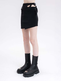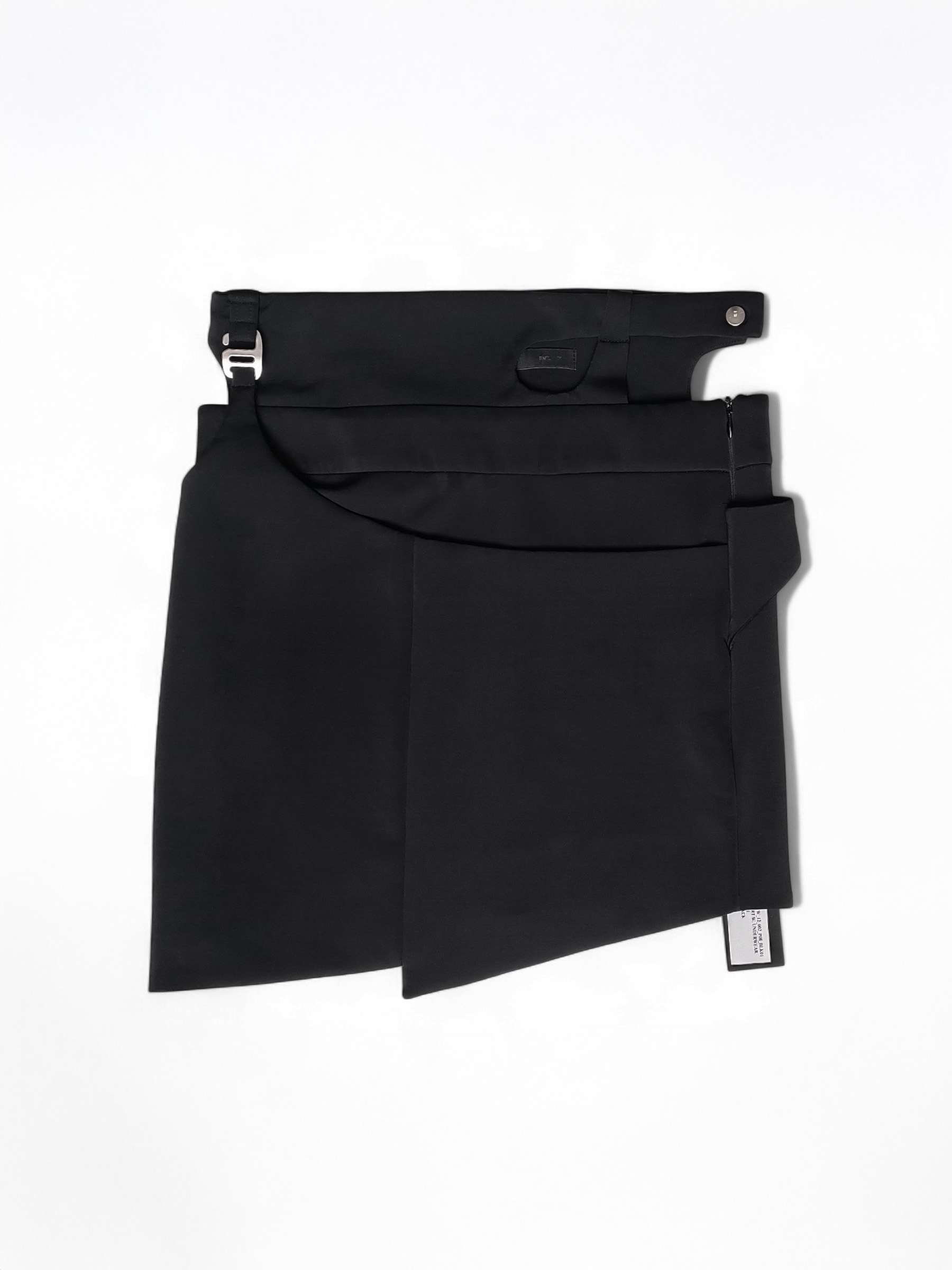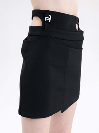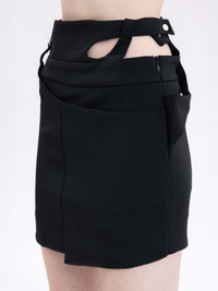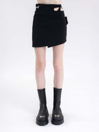 Asymmetric mini skirt with cut-outs and metal trim details. From HELIOT EMIL™ Spring/Summer 2021 'COMPOS MENTIS' Collection. [ Product details ] · Layered skirt · Twist detail with cut out shape · Front layer with g-hook closure · High waist underwear line layer with HE press button closure · Asymmetric hem · Model is wearing size S / 36 [ Care instructions ] · Machine wash cold gently · Do not bleach · Do not tumble dry · Iron low heat · Professional dry clean Protect trims during dry cleaning [ Composition ] · 62% Acrylic, 38% Polyester • Style ID: HE_W_12_002_P08_BLK01 • Size: S /36 • Supplier color: Black • Condition: Brand New with tag • RRP: €300.00 EUR Ready-to-ship worldwide via premium couriers (DHL Express, FedEx, UPS) within 24 hours after payment cleared. *Instruction for International Buyers: Estimated Delivery: About 5~10 days with Tracking Number. Import duties, taxes, and charges are not included in the item price. These charges are the buyer's responsibility. #heliotemil #juulbrothers #darkwear #blackaesthetics #skirt #miniskirt #avantgarde #asymmetrical #ss21 #minimalfashion #deibido
