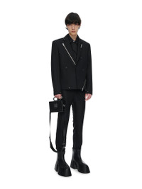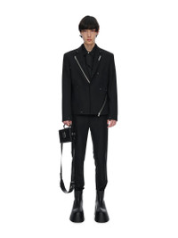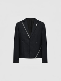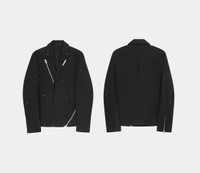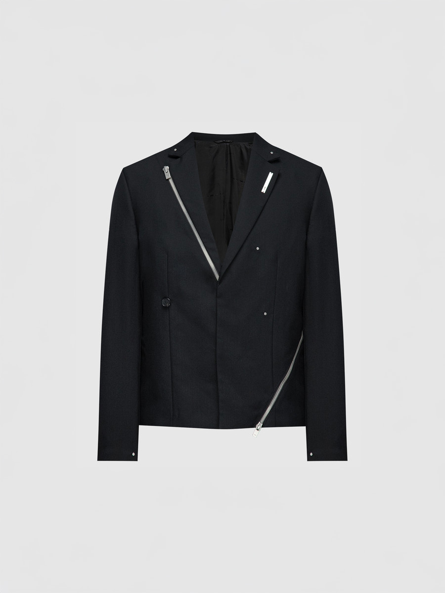 Heliot Emil™ Spring/Summer 2023 'Primal Substance' Cropped and Boxy 'Lucent' Tailored Stretch Recycled Wool-Blend Twill Blazer Jacket in Black with a half canvas for a summery feel. Single breasted with additonal button at front to tighten waist. The lapel and sides can be zipped off or opened. Branded metal zip with new HE zip puller at lapel and left front. Zip vents and rivet appliqués throughout. • DETAILS · Supplier color: black · Cropped fit · Logo plaque at notched lapel · Two Button cuffs · Full acetate- and viscose-blend satin lining · Silver-tone hardware · Wool-kid mohair blend · Classic lapels · Decorative zip detailing · Detachable lapel · Appliqué detailing · Front button fastening · Metal label at collar · Silver-tone stud detailing all over · Dart detailing · Long sleeves · Buttoned cuffs · Straight hem · Made in Romania • COMPOSITION · Outer: 65% Wool, 34% Mohair · Lining: 50% acetate , 50% viscose • CONDITION: Brand New with tag • CARE INSTRUCTIONS · Do not wash · Do not use bleach · Do not tumble dry · Iron medium heat · Dry clean only • STYLE ID: HEM04027BLK01 • SIZE: IT/FR 48 = M • RRP: $1430,00 Shipped worldwide via premium carriers (DHL Express, FedEx, UPS) within 48 hours after payment cleared. *Instruction for International Buyers: Estimated Delivery: About 7~10 business days with Tracking Number. Import duties, taxes, and charges are not included in the item price. These charges are the buyer's responsibility. Check out your country's customs office to determine what these additional costs will be prior to bidding or buying. #heliotemil #unisex #lucent #blazer #darkwear #techwear #avantgarde #asymmetrical #blackaesthetics #blackinspo #luxury #highfashion #juliusjuul #victorjuul #エリオットエミル