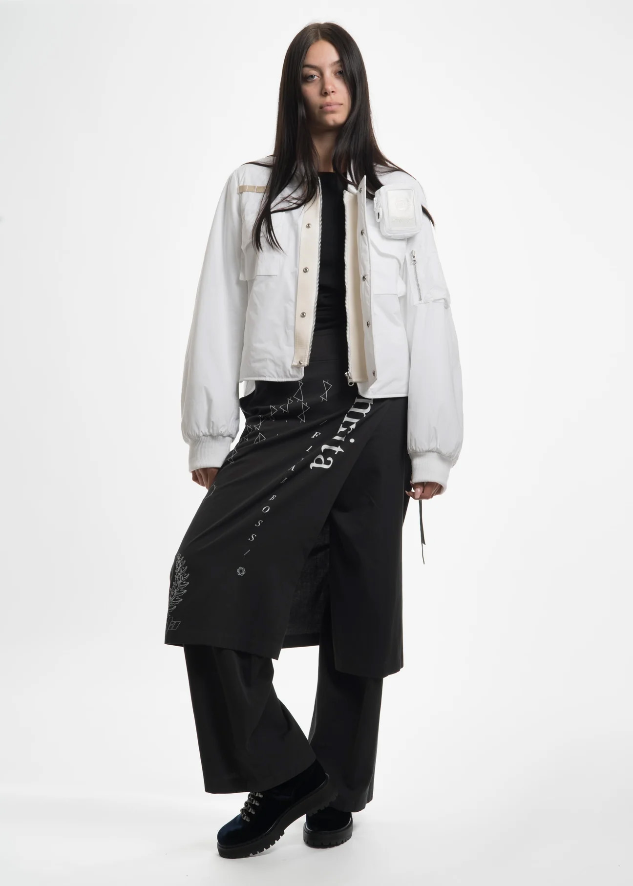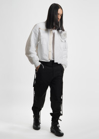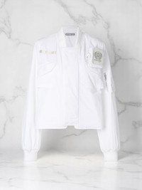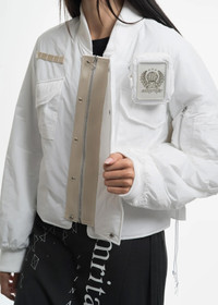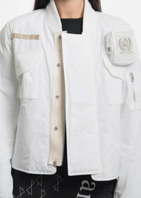 Minimal bomber jacket in blanc cassé nylon. A contemporary take on a classic silhouette, the jacket features a velcro operated detachable cigarette pouch, big enough for king-sized cigarettes. Thick and asymmetric nylon inset over placket, oversized chest pocket, fully functional utility pocket, and herringbone inset evoke the functional structure and aesthetic of a classic military garment. Drawstrings at hem, as well as ribbed collar and sleeves. [ Product details ] - Fits TTS - Regular Cropped Fit - Oversized - Fabric / Material: 100% Polyester - Dry Clean Only - Do Not Bleach - Imported - Made in Korea • Size: 1 (XS/S) • Condition: Close to unused. Pre-owned. • MSRP: $631.00 USD + tax Ready-to-ship worldwide via premium carriers (DHL Express, FedEx, UPS) within 24 hours after payment cleared. *Instruction for International Buyers: Estimated Delivery: About 5~10 days with Tracking Number. Import duties, taxes, and charges are included in the item price. #혜인서 #hyeinseo #bomberjacket #cream #minimalaesthetics #minimalfashion #kfashion #koreanfashion #y2k #avantgarde #cigarettepouch #unisex #deibido #reversibleexclusive #beigeaesthetics