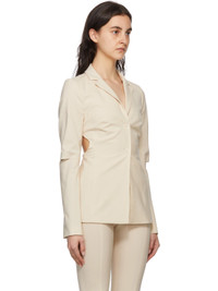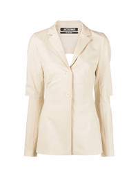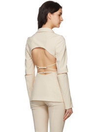 From JACQUEMUS Printemps/Été 2022 'LE SPLASH' Long sleeve stretch plain-woven virgin wool backless blazer in off-white, designed by Simon Porte Jacquemus. - Color: Off-white - Fitted shape - Stretch virgin wool - Contrast stitching - Notched lapel - Long sleeves with slit elbows - Open back with lingerie fastener - Outer: 95% Virgin Wool / 5% Elastane/Spandex - Lining: 48% acetate, 46% cotton, 6% Elastane - Care instructions: Dry clean only - Reference: 221JA005-1021-750 Made in Romania Product details provided by: JACQUEMUS.COM All orders are shipped via UPS Express within 1-3 days after payment cleared.
