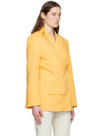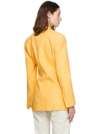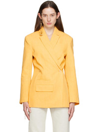 From JACQUEMUS 'Le Papier' FW22 Collection. Linen and viscose-blend hopsack yellow blazer designed by Simon Porte Jacquemus. · Notched lapel · Double-breasted button closure · Welt and flap pockets · Ribbon detail with D-ring hardware at side seam · Padded shoulders · Vented cuffs and back hem · Full twill lining · Body: 60% linen, 26% viscose, 14% polyester. · Lining 1: 48% acetate, 46% cotton, 6% elastane. · Lining 2: 65% polyester, 35% cotton. Made in Romania. Shipped worldwide via UPS within 3-5 days after payment cleared.