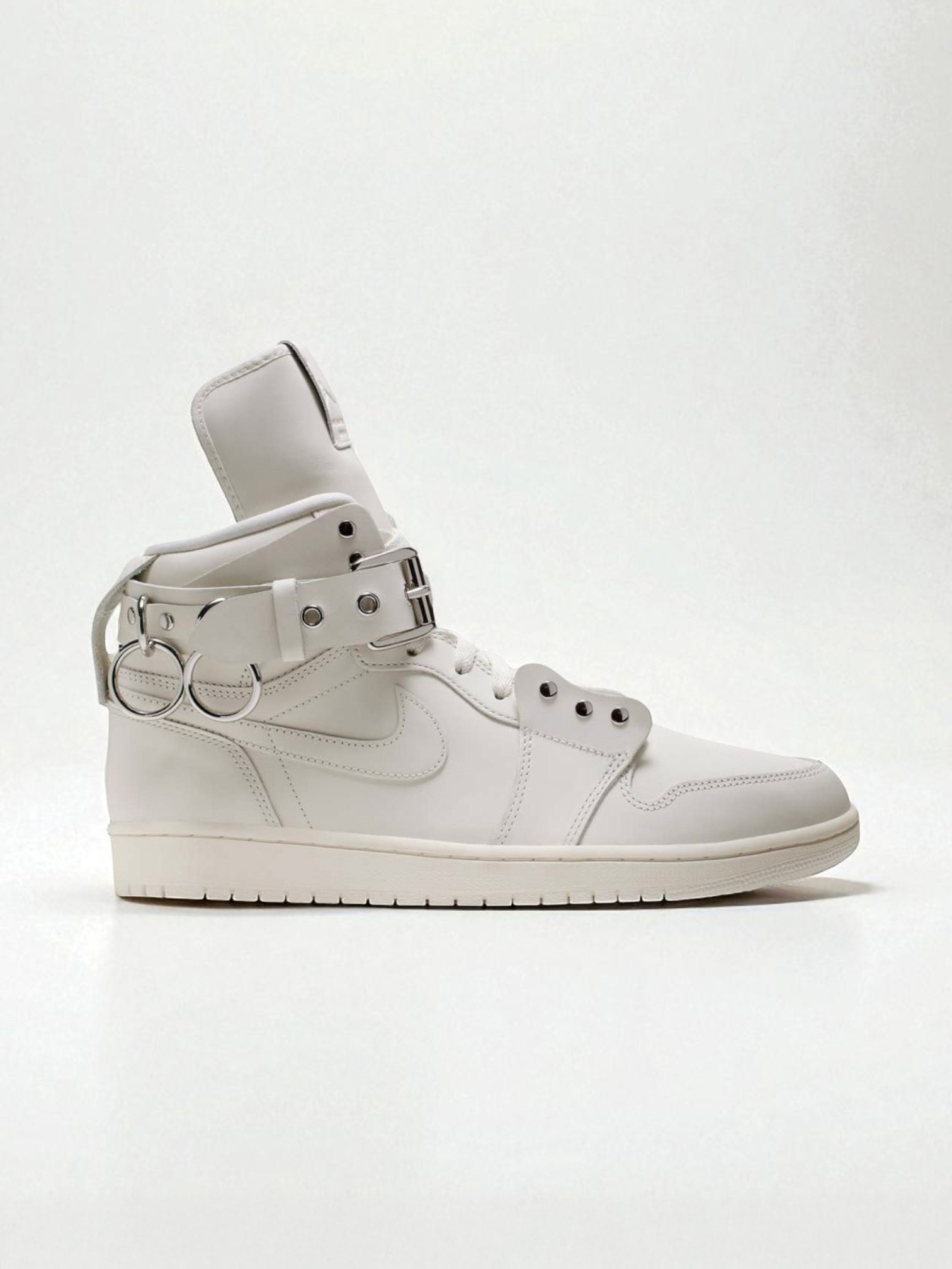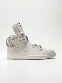 Unveiled during Rei Kawakubo's Fall/Winter 2019 runway showcase at Paris Fashion Week. The Comme des Garçons x Air Jordan 1 Retro Strap High elevates the icon with a punk-inspired aesthetic and luxury elements. This edition features a white leather upper with studded eyerows, an exaggerated tongue and debossed branding. A buckled strap with O-rings circles the ankle. The Air-assisted midsole and pivot point rubber outsole retain the sneaker's classic functionality. • SKU: CN5738 100 • OG Designer: Peter Moore • COLORWAY: White / Sail • RETAIL: $350 USD • RELEASE DATE: 09/14/2019 Shipped worldwide via UPS within 3-5 days after payment cleared. #nike #cdg #commedesgarcons #beigeaesthetics