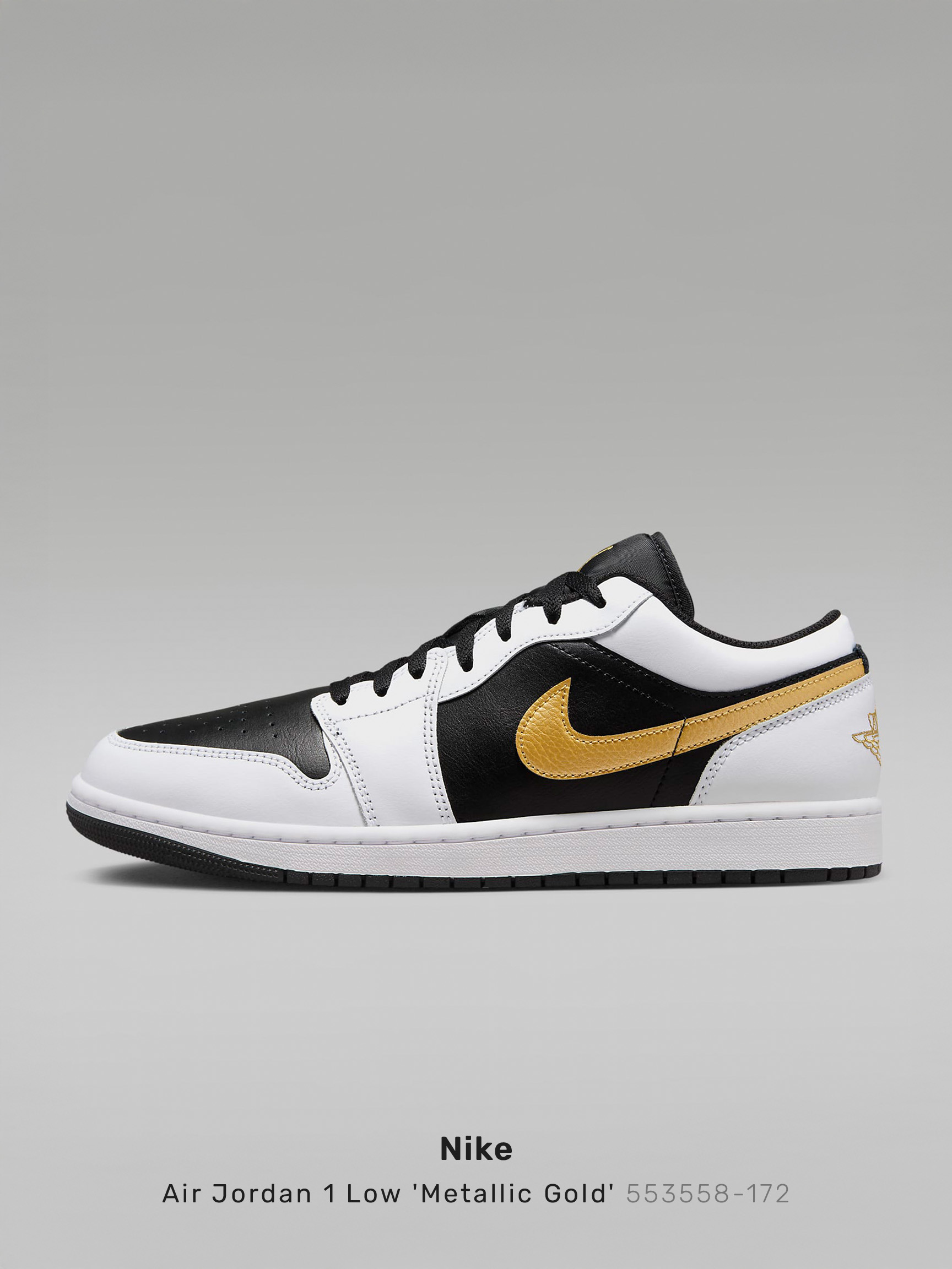 AJ1 Low 'White Black Metallic Gold Swoosh' (2024) Inspired by the original that debuted in 1985, the Air Jordan 1 Low offers a clean, classic look that's familiar yet always fresh. With an iconic design that pairs perfectly with any 'fit, these kicks ensure you'll always be on point. [ BENEFITS ] · Encapsulated Air-Sole unit provides lightweight cushioning. · Genuine leather in the upper offers durability and a premium look. · Solid rubber outsole enhances traction on a variety of surfaces. [ DETAILS ] · Designer: Peter Moore · Nickname: AJ1 Gold Swoosh · Upper: Leather · Category: Lifestyle • Size: US 12.5 / EUR 47 / 30.5cm • SKU: 553558-172 • Colorway: White / Black / Metallic Gold • Condition: Brand New with OG box • Retail price: $115 USD • Release date: 01/06/2024 Ready-to-ship worldwide via premium carriers (DHL Express, FedEx, UPS) within 24 hours after payment cleared. #nike #aj1 #airjordan1 #metallicgold #goldswoosh #snkrs #sneakers #lifestyle #jumpman #blackandgoldaesthetics