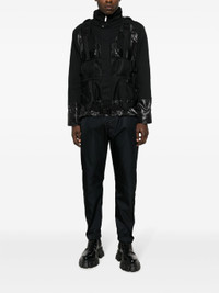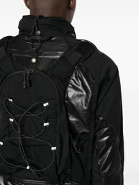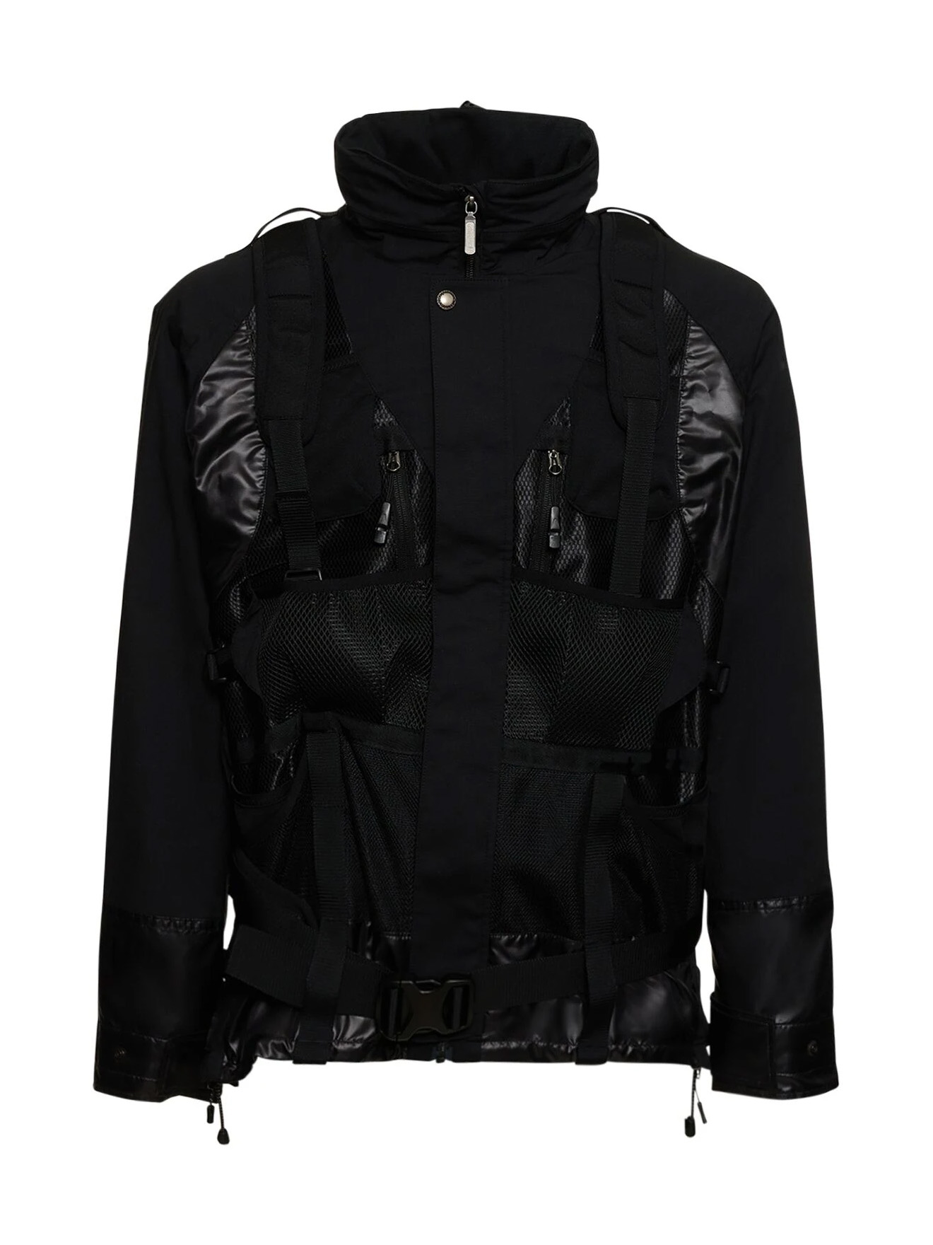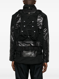JUNYA WATANABE — Black core stretch cotton-blend ripstop and polyester taffeta zipped utility jacket. • DETAILS: · Layered and paneled construction · Stowaway hood · Bungee-style drawstring at stand collar · Zip closure with press-stud placket · Zip and patch pockets · Detachable padded press-release belt · Concealed bungee-style drawstring at hem · Fidlock® flip-clasp strap at side seams · Two-way zip vent at sides extends to underarms · Detachable padded shoulder straps · Adjustable press-stud tab at cuffs · Backpack-style two-way zip pocket at back · Bungee-style drawstring and reflective trim at back · Patch pockets with bungee-style drawstring at back · Concealed zip pocket at back waist · Zip pockets at interior · Full taffeta lining · Faux-leather · Gunmetal-tone hardware · Supplier Color: Black mix • COMPOSITION: · Outer: Nylon 29%, Polyurethane 2%, Cotton 69% · Lining: Polyester 100% • RETAIL: €1950 EUR • MADE IN JAPAN Shipped worldwide via UPS within 3-5 days after payment cleared. Any duties are included in the item price. #innerraum #junyawatanabeman #junyawatanabe #techwear #darkwear #avantgarde #blackaesthetics #backpack
