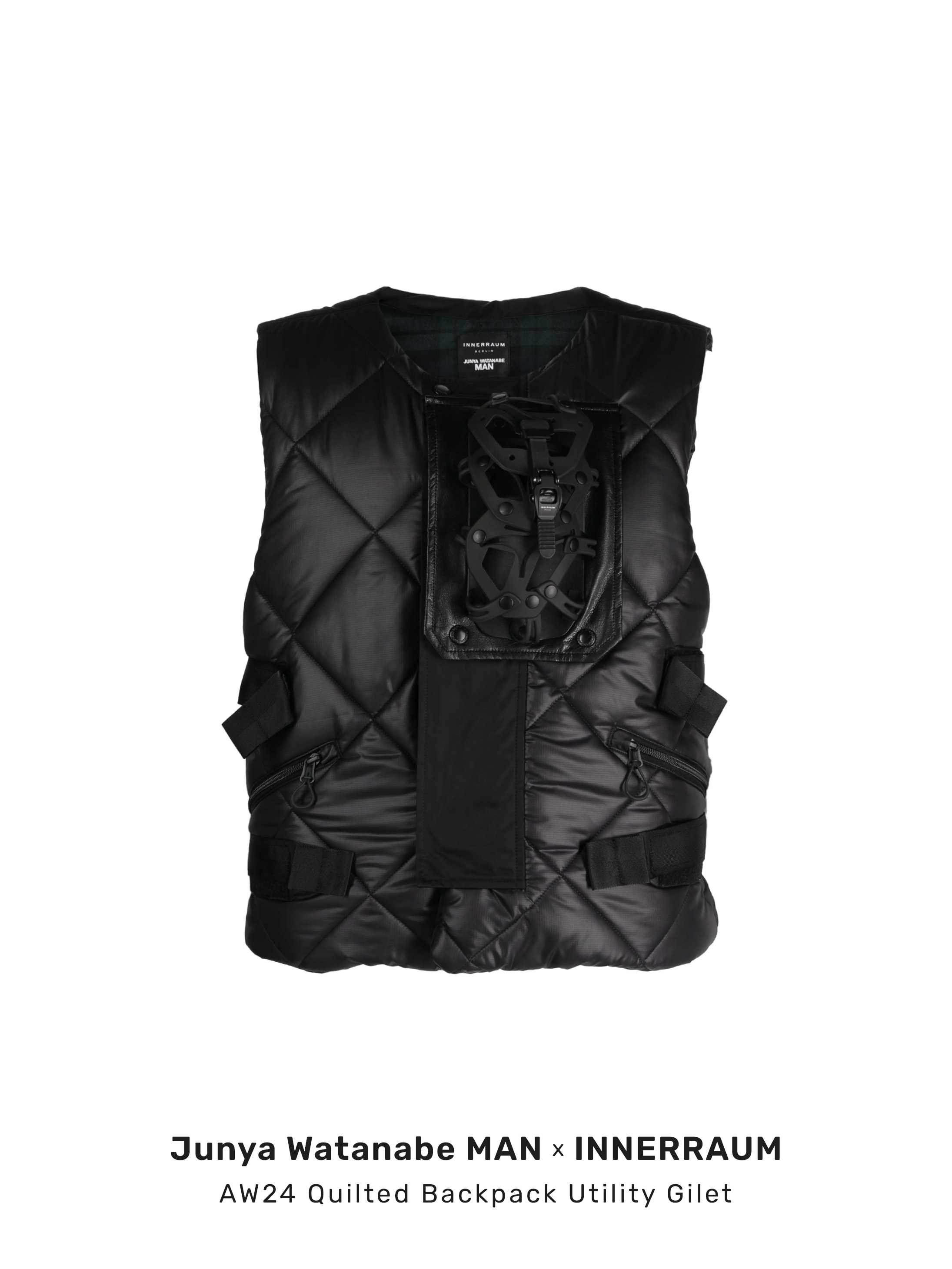 Junya Watanabe MAN x INNERRAUM AW24 Quilted Backpack Utility Gilet. PRODUCT DETAILS · Fits TTS · Padded design · Diamond quilting · Strap detailing · Round neck · Front press-stud fastening · Sleeveless · Two side zip-fastening pockets · Removable pouch · Model is 1.87 m wearing size M COMPOSITION · Outer: Polyester 100%, Nylon 100%, Polyurethane 100%, Cotton 100% · Lining: Polyester 100%, Wool 90%, Nylon 9%, Polyurethane 1% CARE INSTRUCTIONS · Dry Clean Only ▪ Size: M ▪ Supplier color: black ▪ Condition: Excellent Shipped worldwide via premium carriers (DHL Express, FedEx, UPS) within 3-5 days after payment cleared. *Instruction for International Buyers: Estimated Delivery with Tracking Number may vary depending on the location. Import duties, taxes, and charges are not included in the item price. #junyawatanabe #aw24 #innerraum #techwear #futuristicfashion #avantgarde #darkwear #blackaesthetics #runwaypiece #deibido