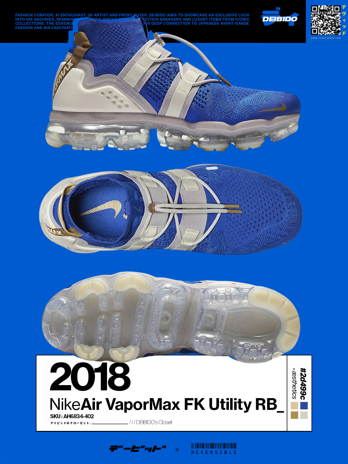 The Nike Air VaporMax Flyknit Utility Racer Blue debuted almost a decade ago, in Summer 2018. Following the Team Red edition, the all-terrain silhouette features a blue Flyknit upper, enhanced by a gray lacing system and a white neoprene heel. Bronze accents on the branding, a touch of 3M reflective material, and a translucent VaporMax unit complete the look. The Nike Air VaporMax Flyknit Utility Racer Blue will arrived on August 2nd, 2018 at selected Nike Sportswear retailers like Sneakersnstuff and online at Nike.com, priced around $225,00 USD. ▪ SKU: AH6834-402 ▪ Size: US 8 / EU 41 (DS) ▪ Condition: Close to unused with dustbag ▪ Colorway: Racer Blue / Muted Bronze-Moon Particle-Light Cream-Deep Royal Blue ▪ Release date: 02/08/2018 Ready-to-ship worldwide via premium carriers (DHL Express, FedEx, UPS) within 24 hours after payment cleared. *Instruction for International Buyers: Estimated Delivery with Tracking Number may vary depending on the location. Import duties, taxes, and charges are not included in the item price. #nike #vapormax #vintage #archive #snkrs #deadstock #blueaesthetics #techwearshoes #deibido #デービッド